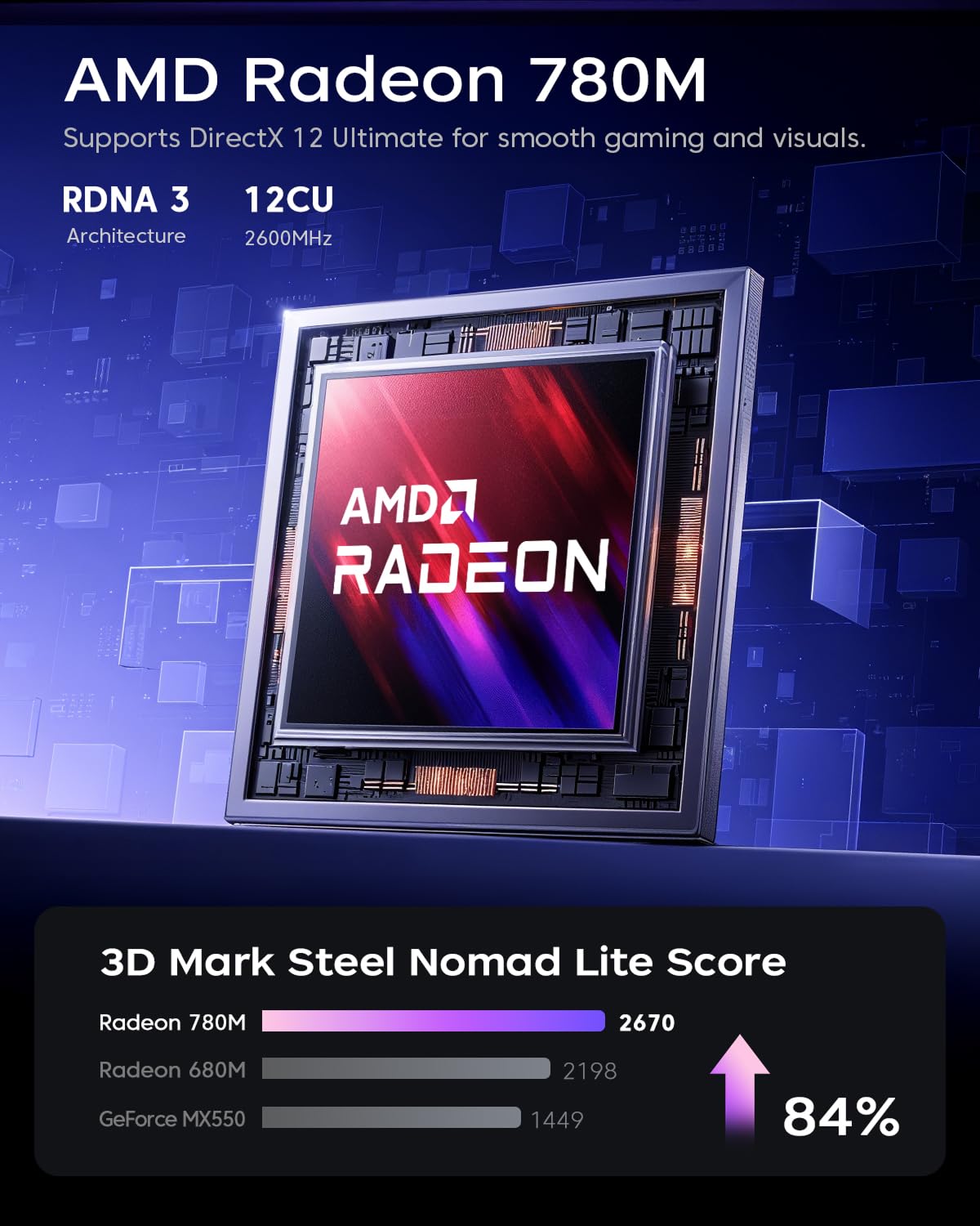 【AMD Radeon 780M GPU-Rembrandt at its best】A big novelty is the integrated GPU Radeon 780M, that is now based on the RDNA2 architecture and offers 12 CUs at up to 2.4 GHz. This ensures that all modern games will run on ACEMAGICIAN computers. The AMD Radeon 680M delivers almost 8x the frame rate of the previous Vega 2 chip in most games. Compared to the Iris Xe chip in the 12th and 11th gen Intel processors, the Radeon 780M ends up scoring ~50% higher in 3Dmark and Superposition. AMD Radeon 780M is known as "The most powerful core graphics card", which is comparable to entry-level discrete graphics cards!