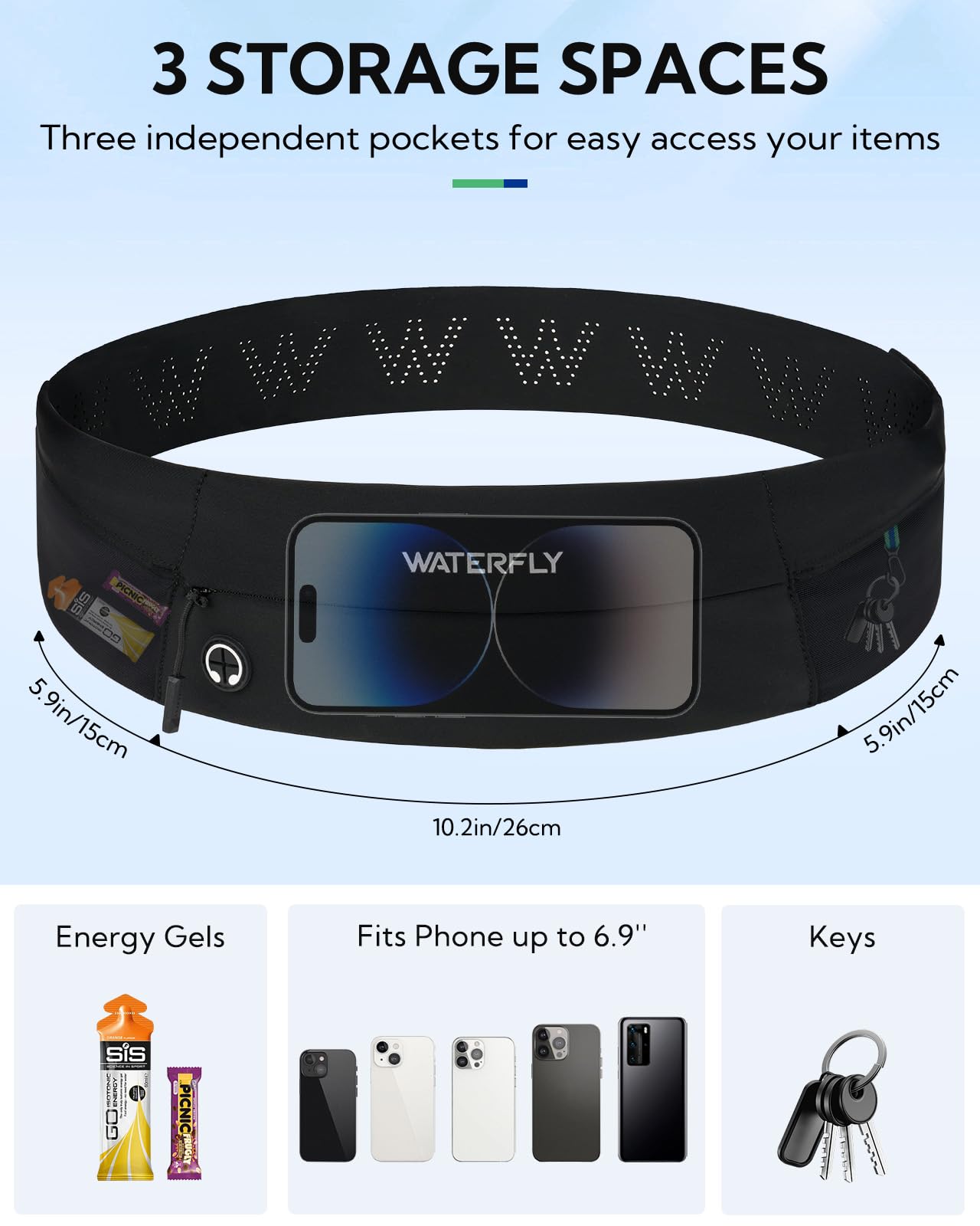 Quick-access Pocket Design: This running belts for women has a zipper pocket can hold up to 6.9 in phone, the two flap mesh pockets can store earphones, energy gels, tissues, keys and more