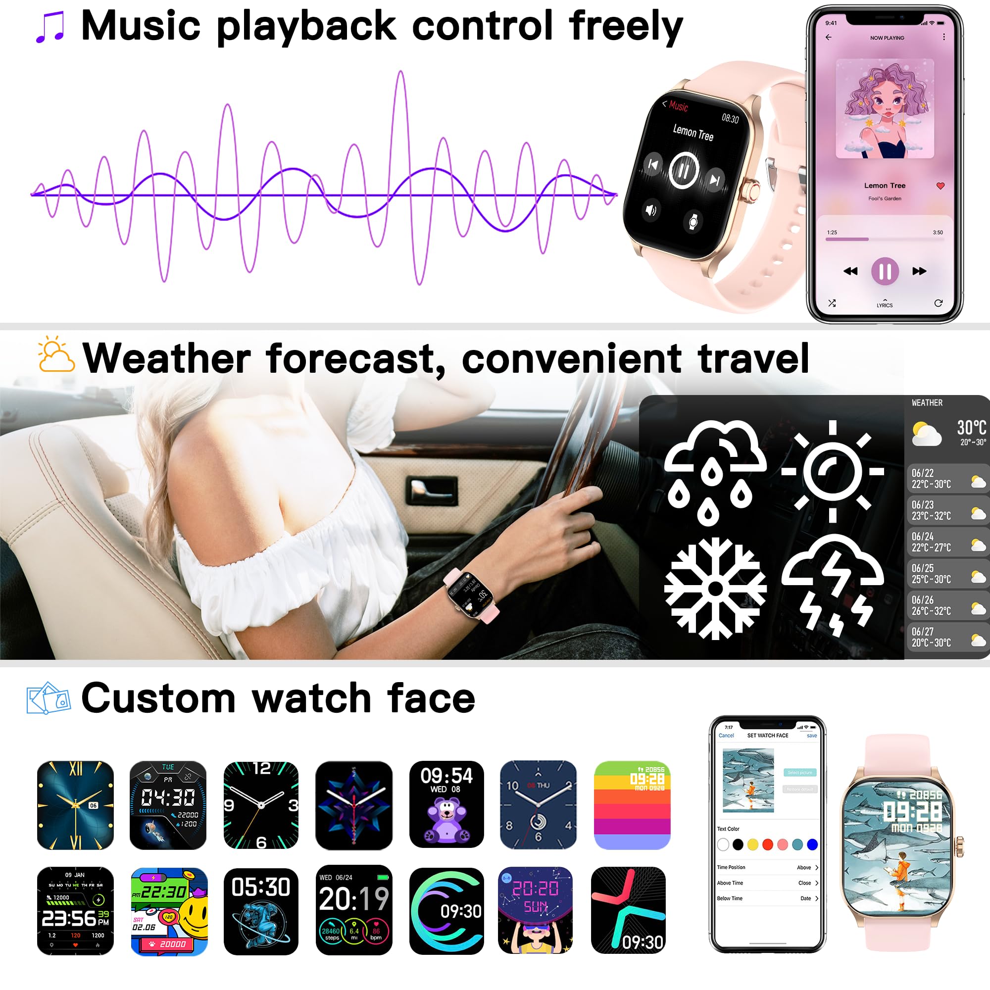 IP68 Waterproof and Additional Features:The smart wacth has multiple functions such as timer, stopwatch, alarm clock, sedentary reminder, music control, weather forecast, brightness adjustment, photo control, calculator, etc. Besides, IP68 water and dust resistant rating, the sport watch can beused even when washing hands and in the rain.