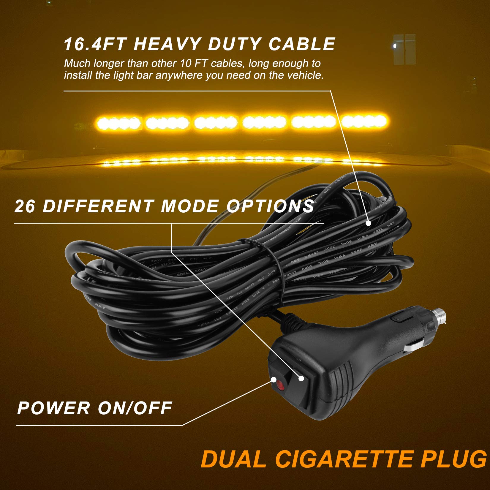 【26 FLASHING MODES】Double switch buttons setting, 26 Patterns to choose from. You can switch ON/OFF or select the flashing mode conveniently at the cigarette lighter plug buttons. Last used pattern recall/memory function.