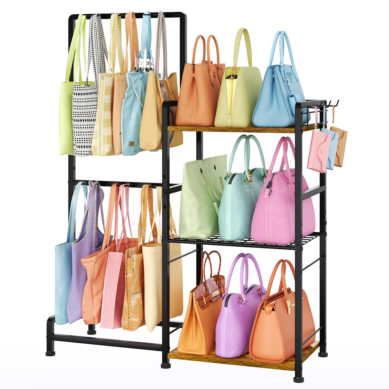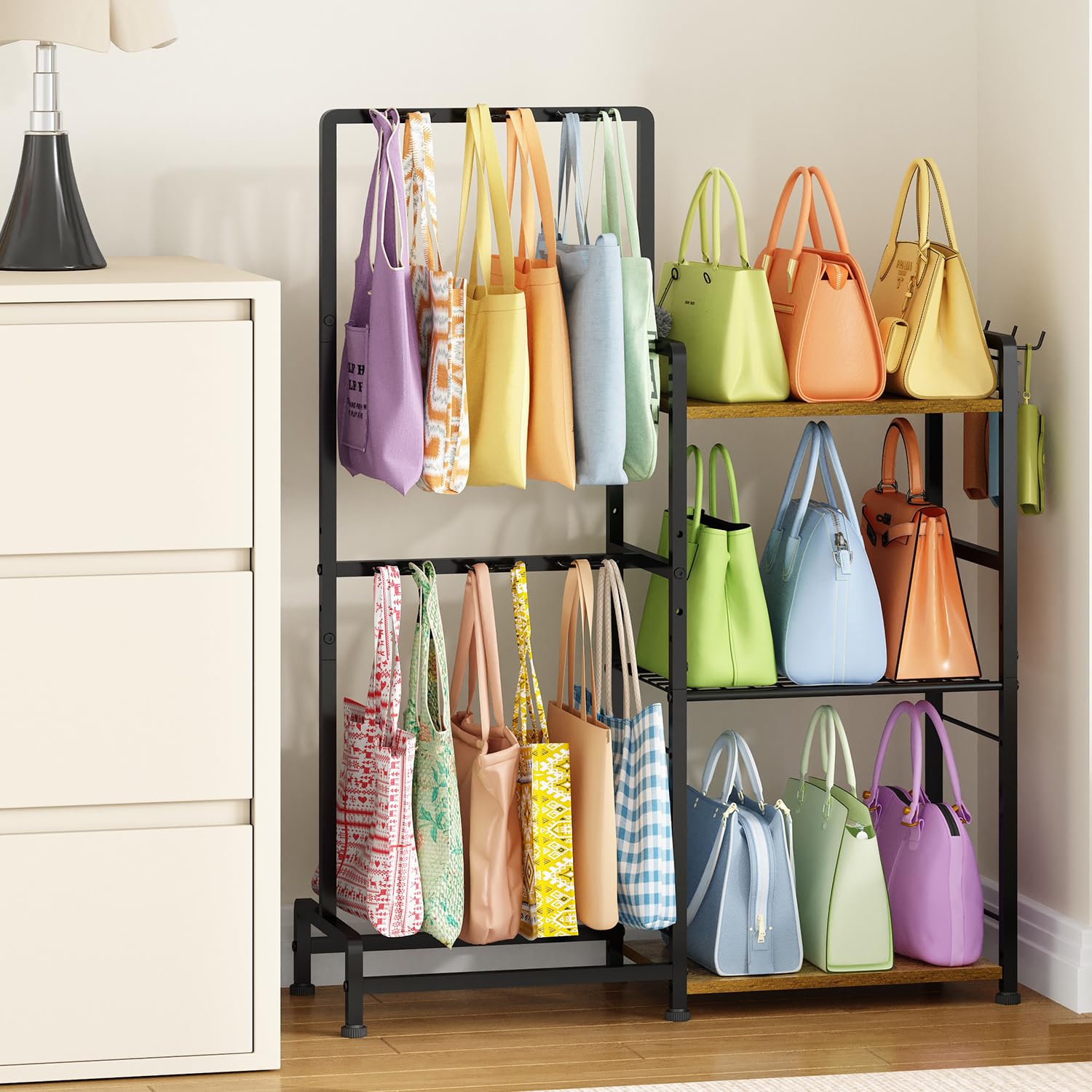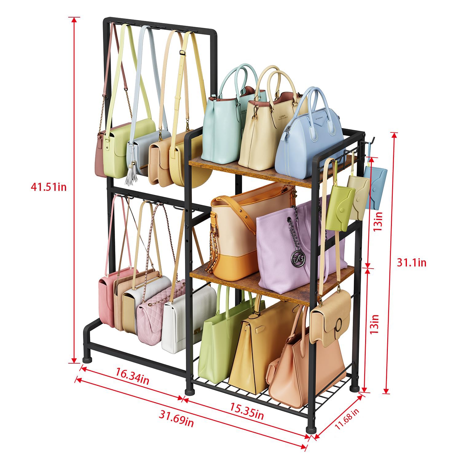 【Powerful Storage Functions】:This is a standing purse organizer shelf with powerful storage functions. There are 2 layers of hooks on the left side, each layer has 6 hooks, which can fully store every beloved bag you have. On the right is a 3-layer purse storage rack with a fence on the top. It can easily accommodate bags of various sizes and styles. Whether it's a small handbag or a spacious backpack, you can find a suitable location.It is good purse organizer closet systems.