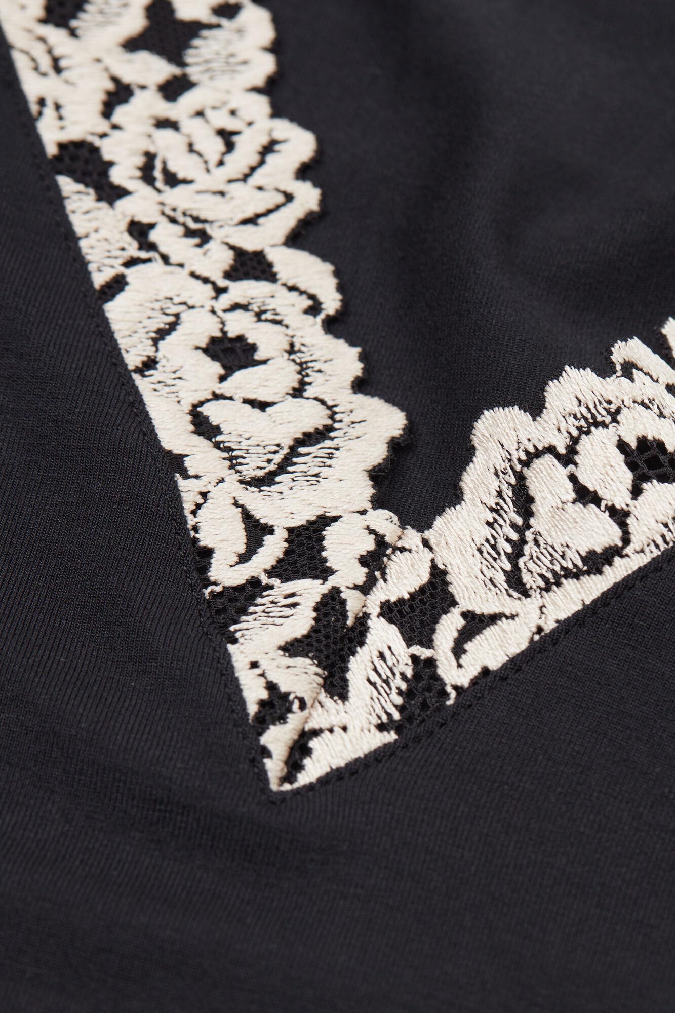 Description Soft modal tank top with neckline trimmed with an elegant floral motif lace ruffle.
