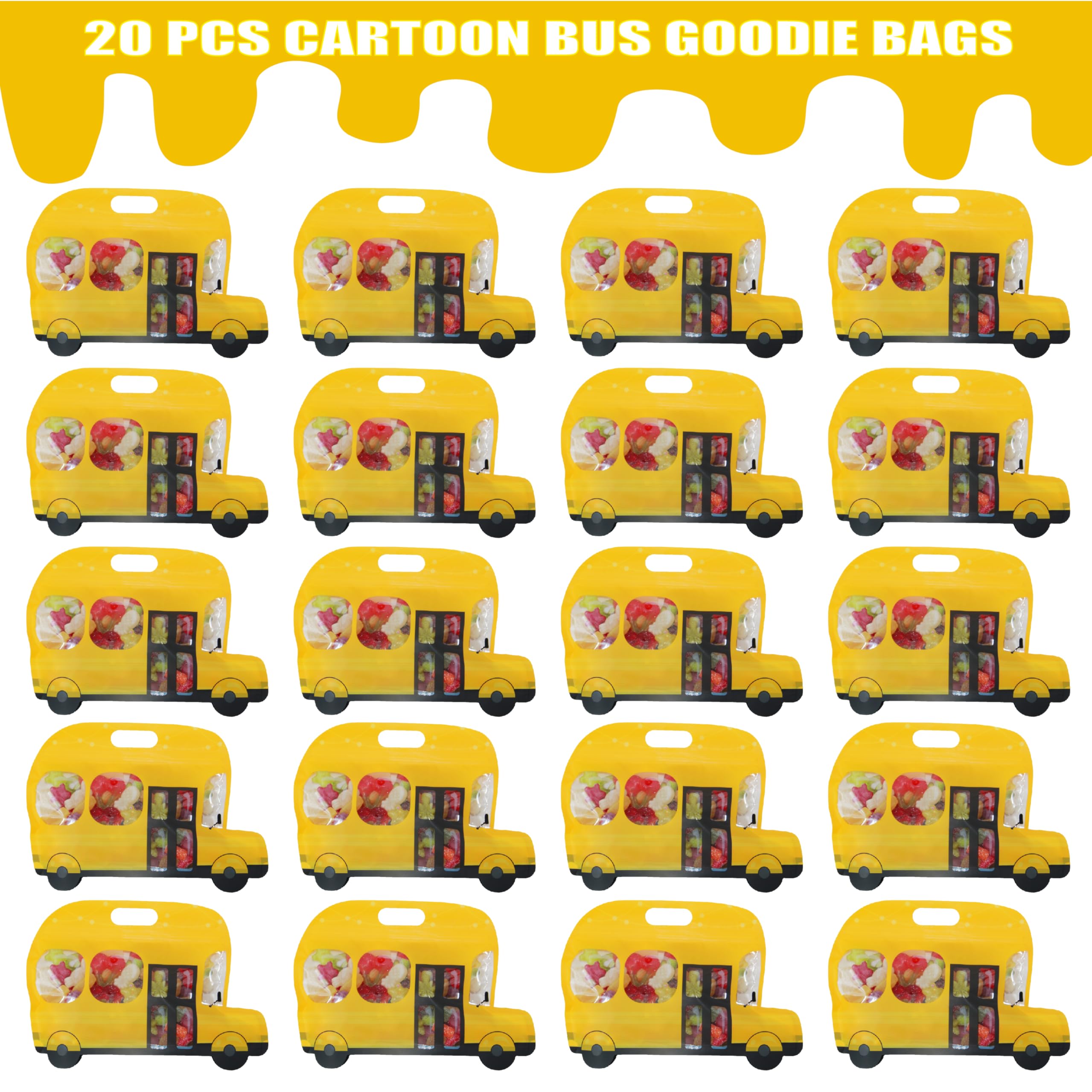 PRODUCT SIZE: Each cartoon bus goodie bag measures 10.2 inches by 7.48 inches . You'll receive 20PCS of school bus themed treat bags, featuring a convenient carrying handle and a wide bottom that ensures they stand upright when filled.