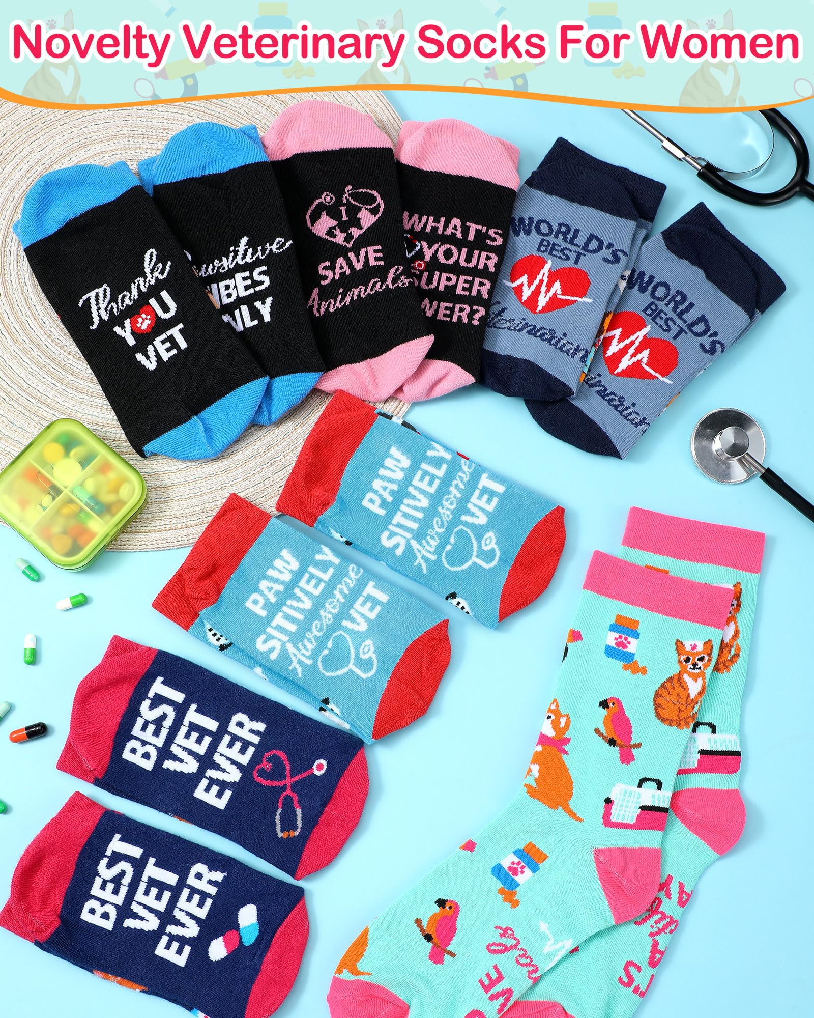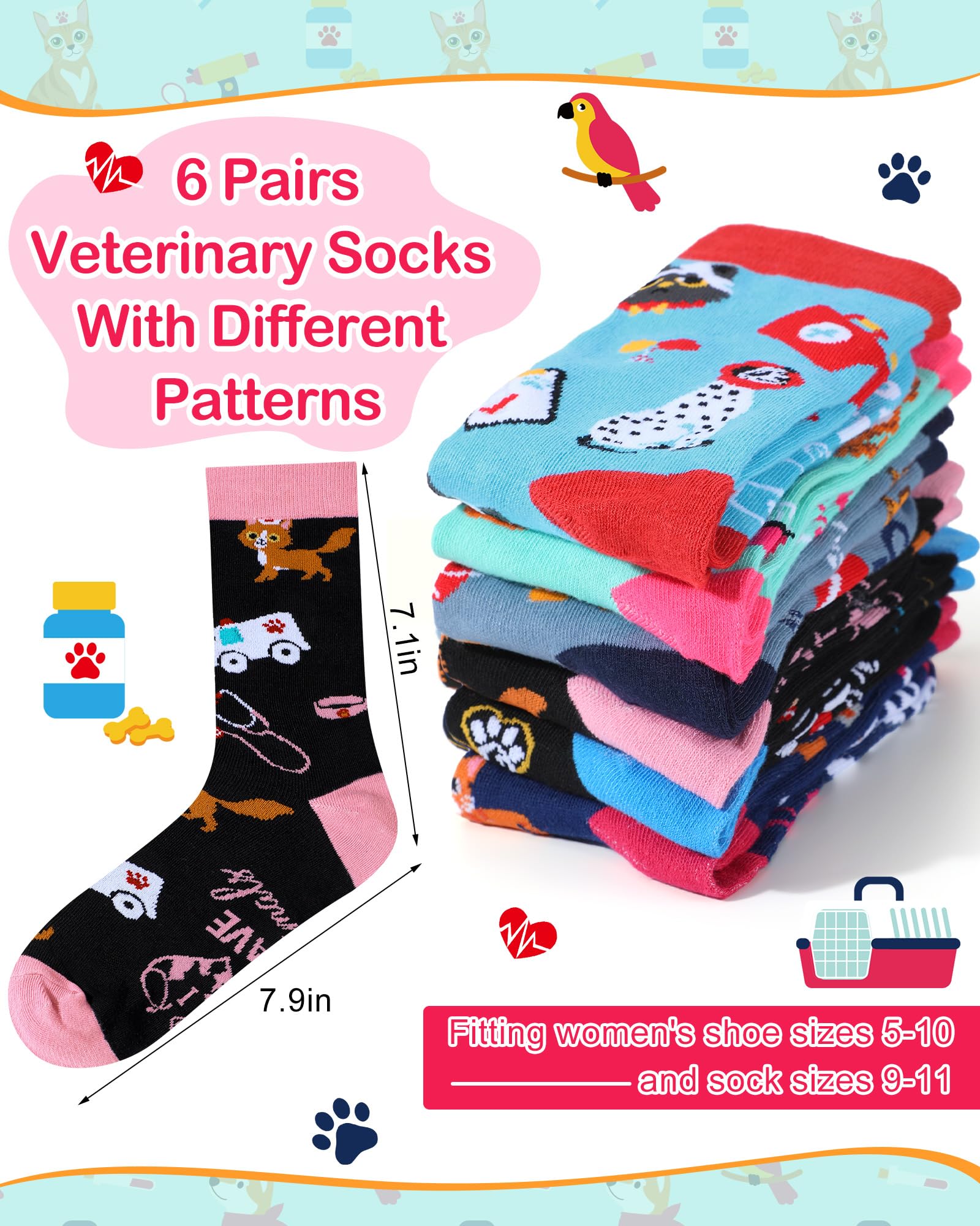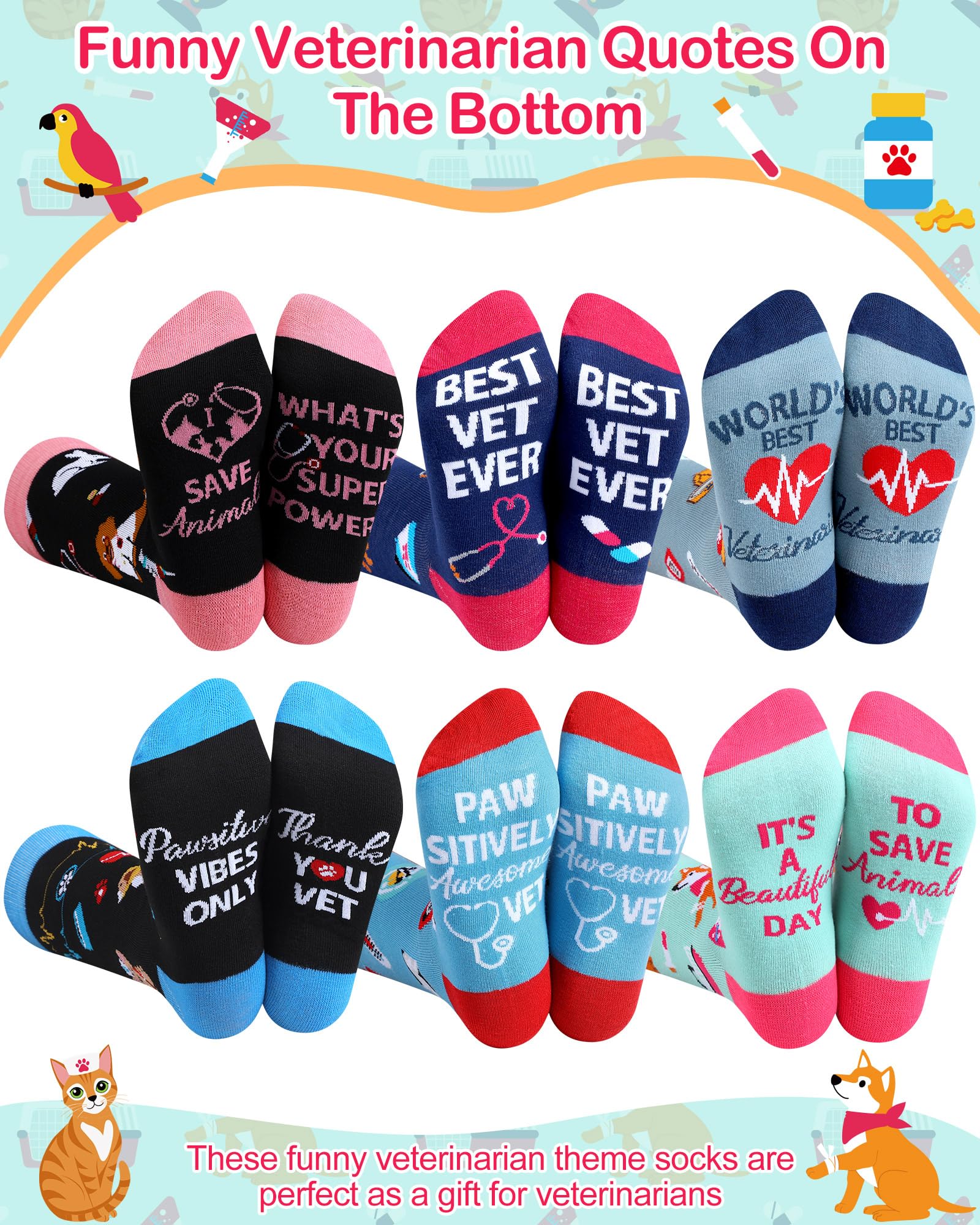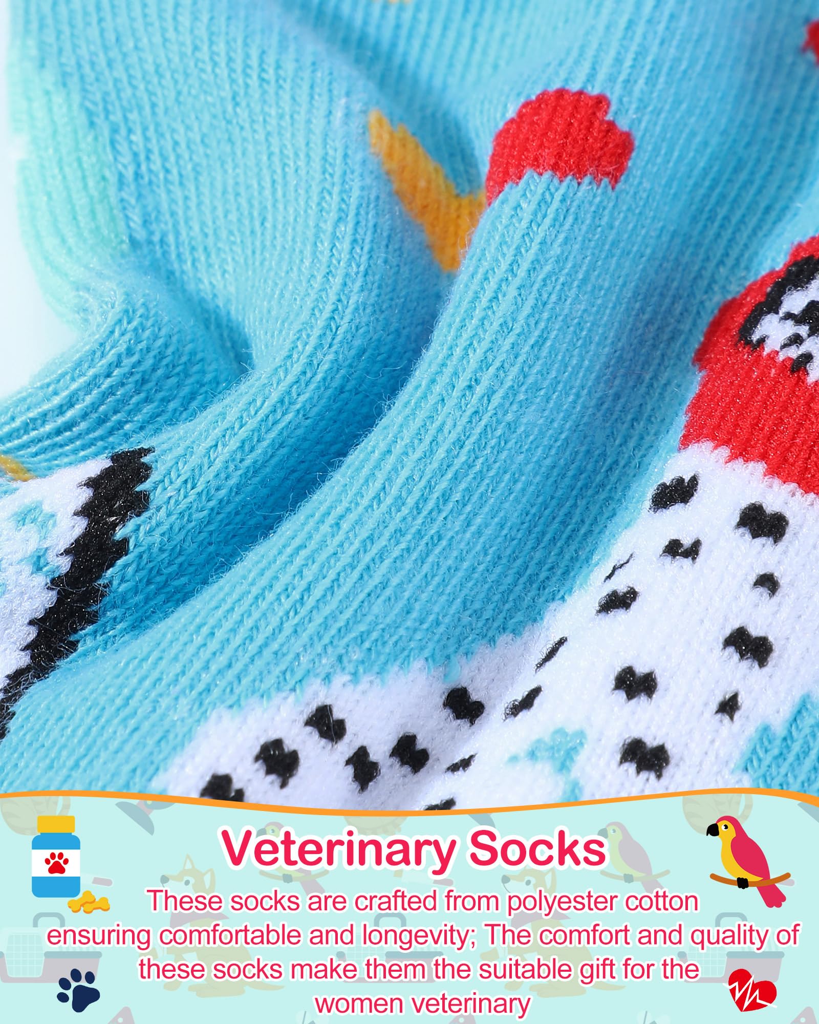 Package List: the package comes with 6 pairs of novelty veterinary socks, nice for vet techs and pet doctors, feature a funny veterinary theme design, including cute animals and other veterinary related patterns; While these socks are perfect for lounging, they can also be worn during work hours for a fun twist in office or hospital
