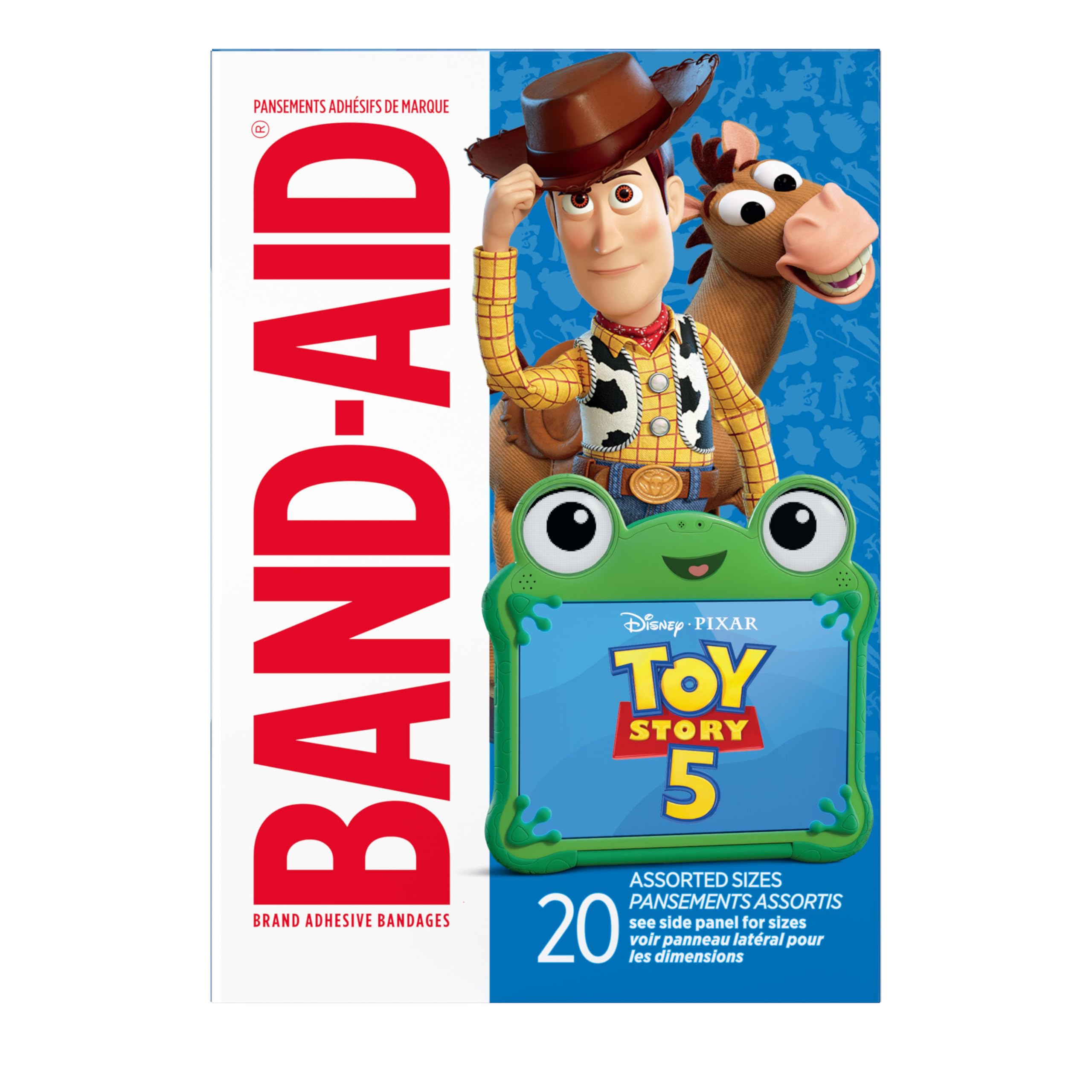 BAND-AID® Brand Adhesive Bandages for kids, featuring Disney and Pixar Toy Story 5 designs, cover and protect minor cuts and scrapes with fun graphics from the animated movie. These sterile bandages come in assorted sizes with designs that include Woody, Buzz Lightyear, Jessie & Bullseye. BAND-AID® Brand Adhesive Bandages stick to the skin, not the wound. This package contains 20 sterile bandages in assorted sizes suitable for small wounds.