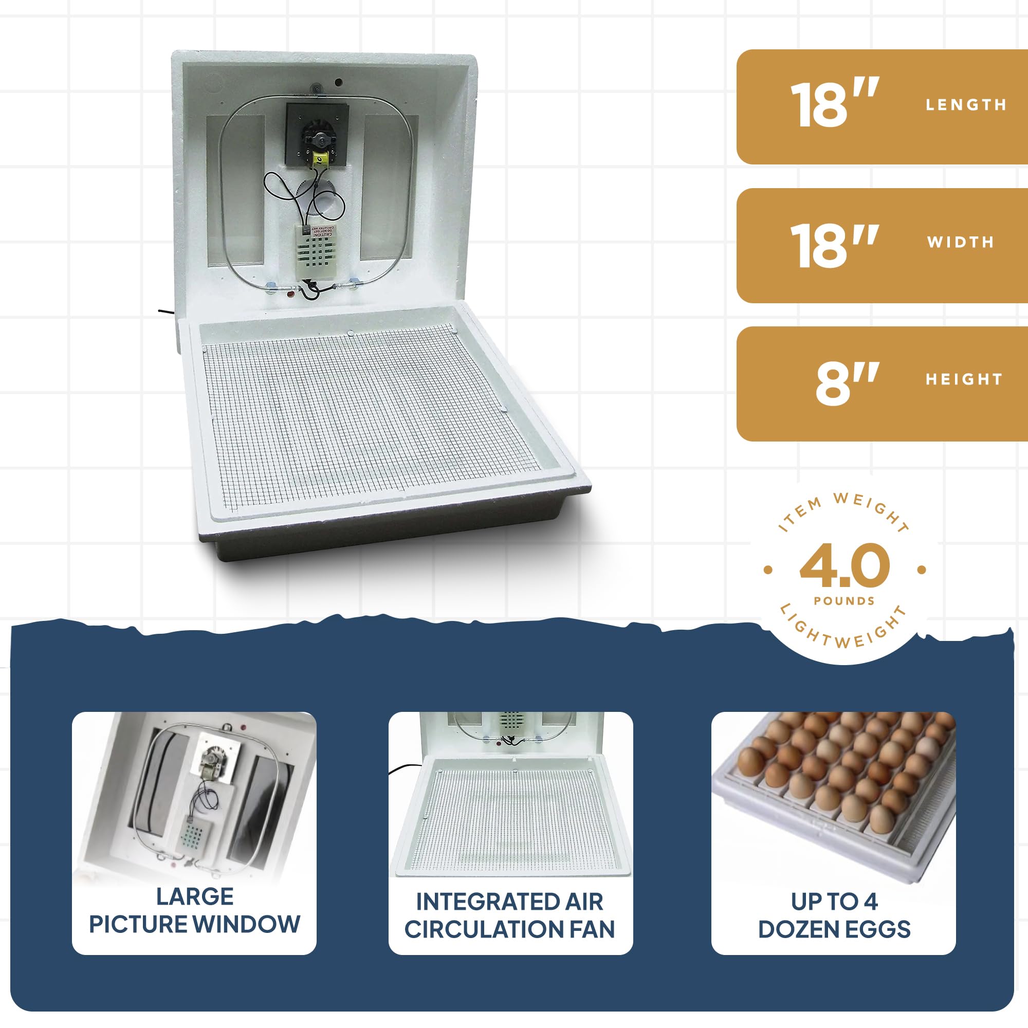 Experience the pinnacle of egg incubation with the Farm Innovators 40W Digital Circulated Air Incubator. Designed for simplicity and efficiency, this incubator effortlessly accommodates up to 4 dozen eggs, making it ideal for both hobbyists and educational purposes. The Incutek heater swiftly reaches a preset temperature of 100 degrees Fahrenheit, while an integrated fan ensures consistent airflow, stabilizing temperatures for optimal hatching conditions. Equipped with a user-friendly digital display, monitoring this farm essential's key metrics like temperature, humidity, and days to hatch is a breeze. Customize the days-to-hatch countdown timer to suit a variety of egg types, ensuring precision throughout the incubation process. Plus, stay informed with the high/low-temperature notification light, which alerts you to any deviations outside the optimal range. Thanks to its large picture window, this chicken habitat supply offers a panoramic view inside, perfect for educational observation. From chicken to quail, duck to goose, and beyond, hatch a diverse range of eggs with ease, and with its deep bottom tray, even large duck and goose eggs fit comfortably. Crafted with recycled insulating polystyrene foam. Additionally, the EZ fill water channels allow for convenient water replenishment without the need to remove the lid, streamlining your incubation process. For added convenience and improved hatch rates, consider pairing the incubator with the optional Model 3200 automatic egg turner (sold separately). Improve your hatching experience with the 40W Digital Circulated Air Incubator from Farm Innovators where innovation meets simplicity for successful egg incubation every time.