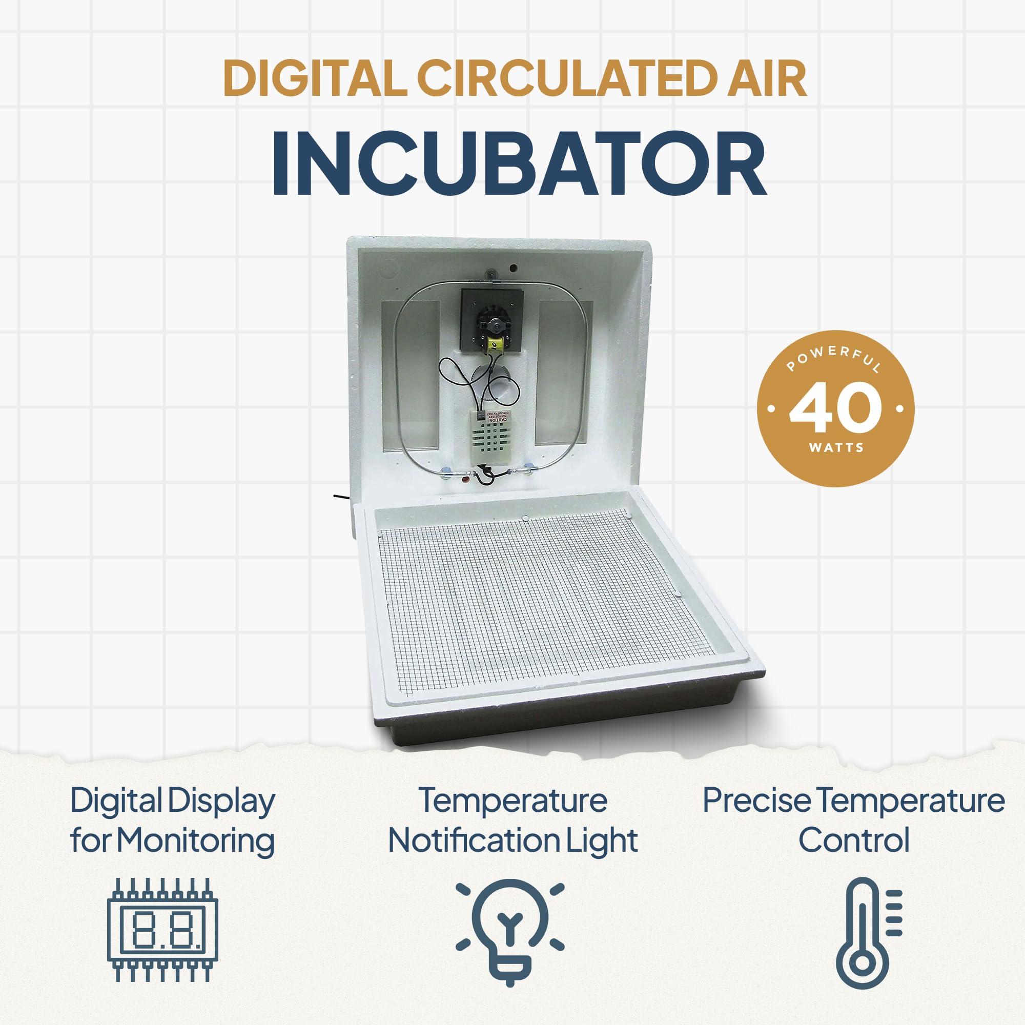Consistent Air Circulation: Integrated fan ensures fresh air circulation throughout the incubator, stabilizing temperatures and enhancing hatch rates