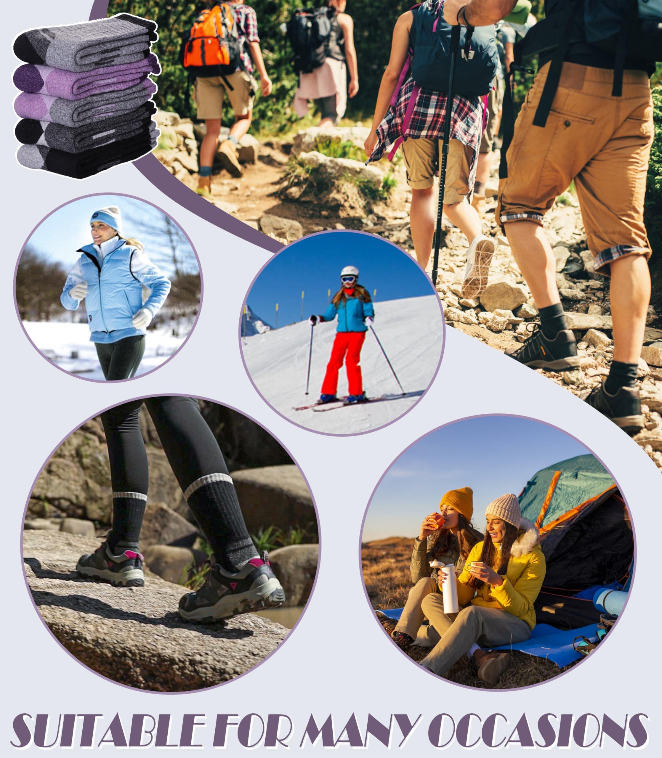 ELASTICITY - These warm hiking socks for womens have high elasticity and arch stripe,which can enhance the blood moving ,relieve symptoms varicose and keep socks stable.They can greatly improve your comfort in hiking , running , walking , climbing , trekking or everyday wear.