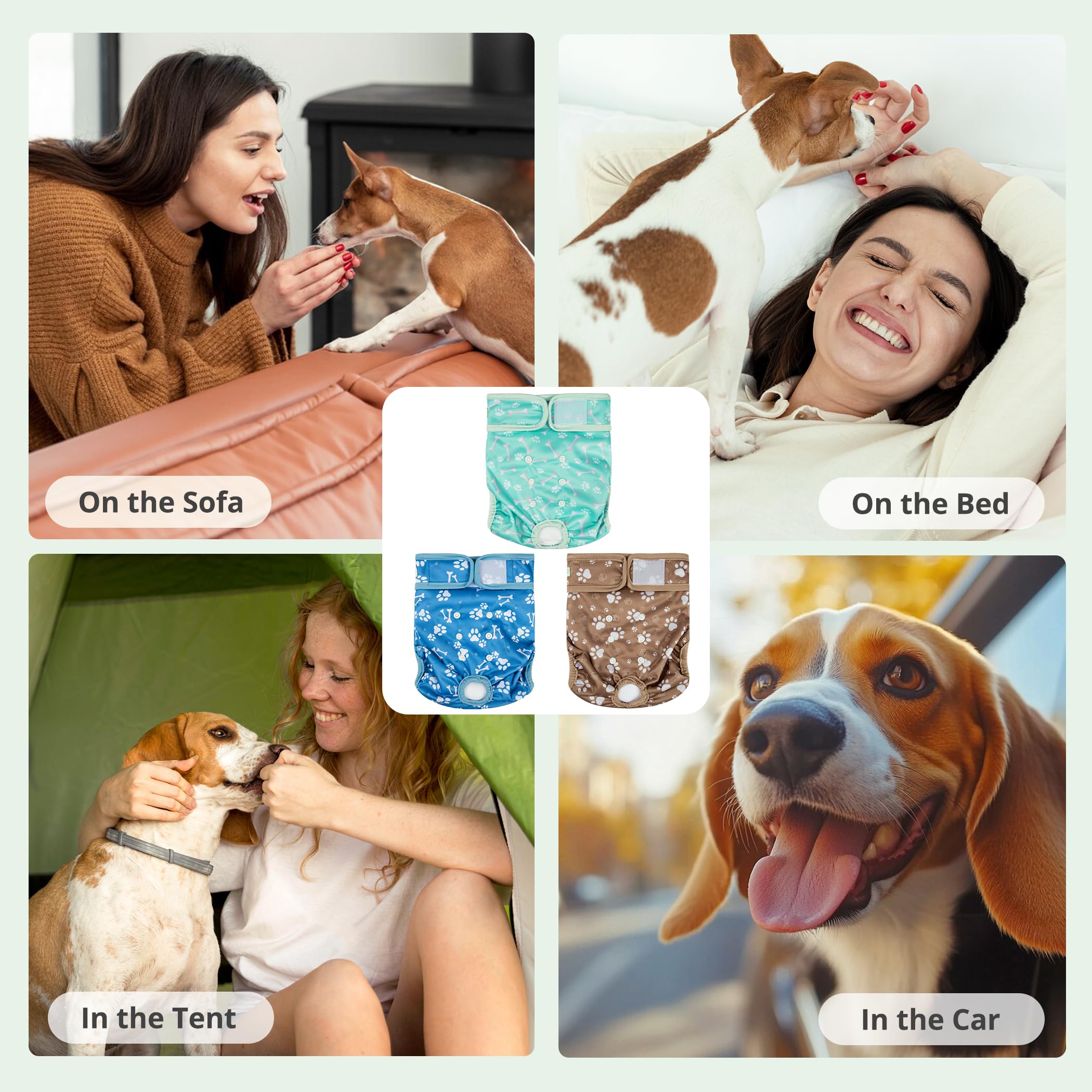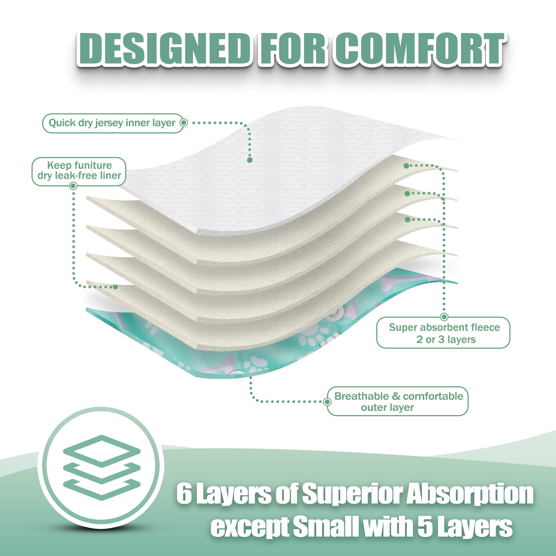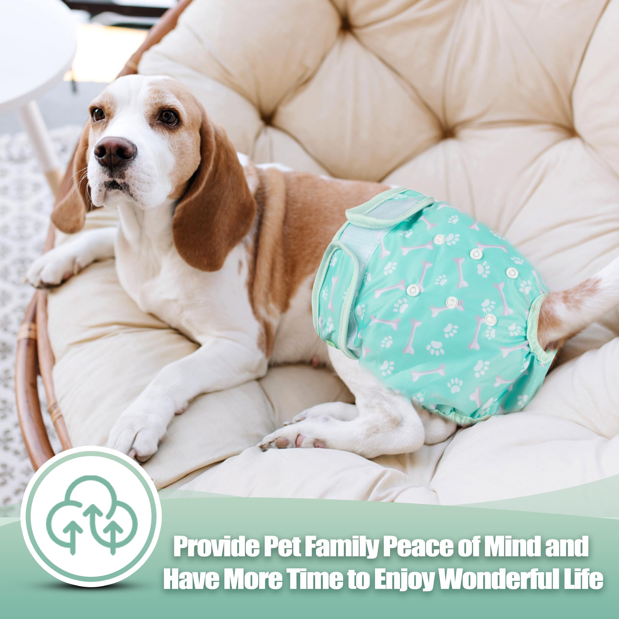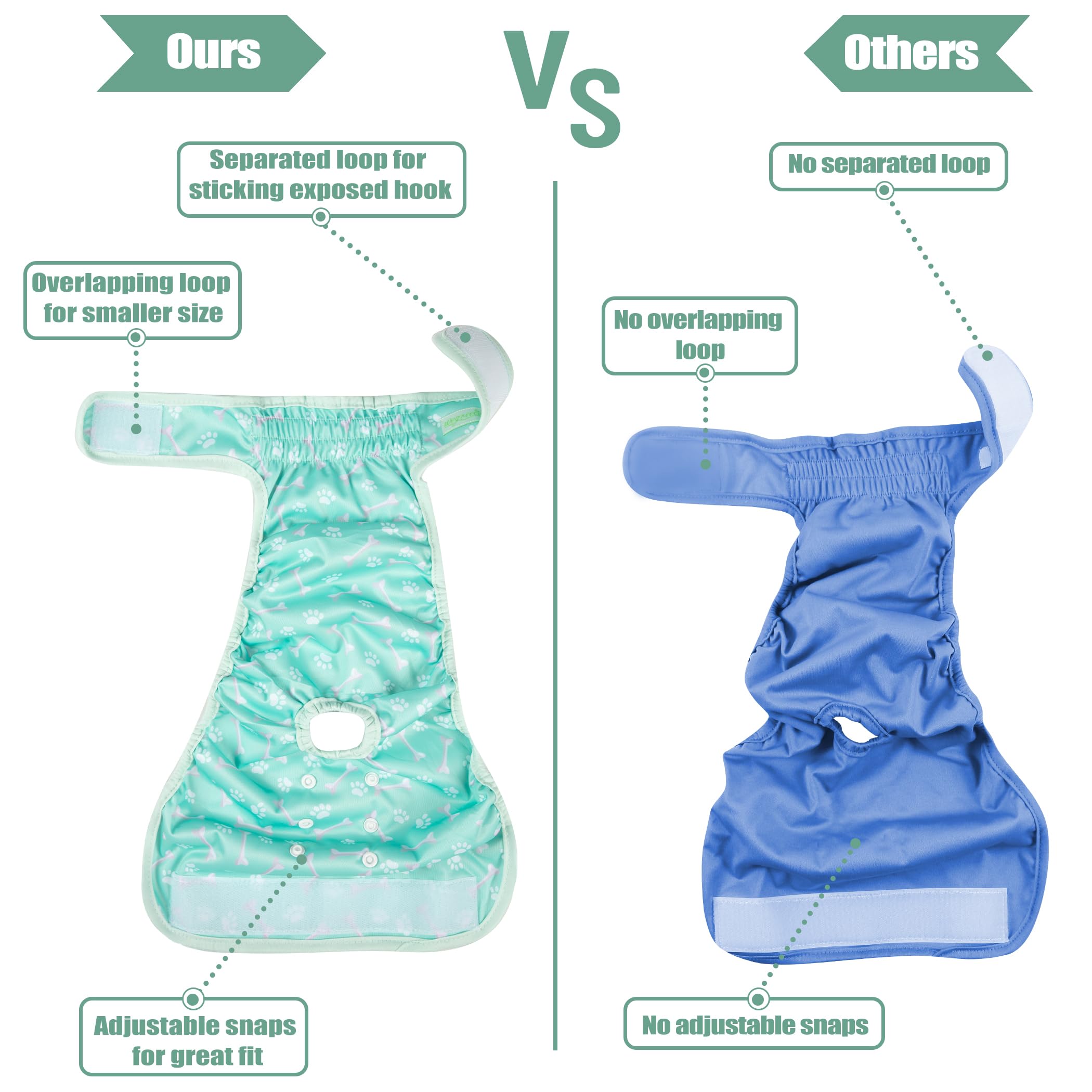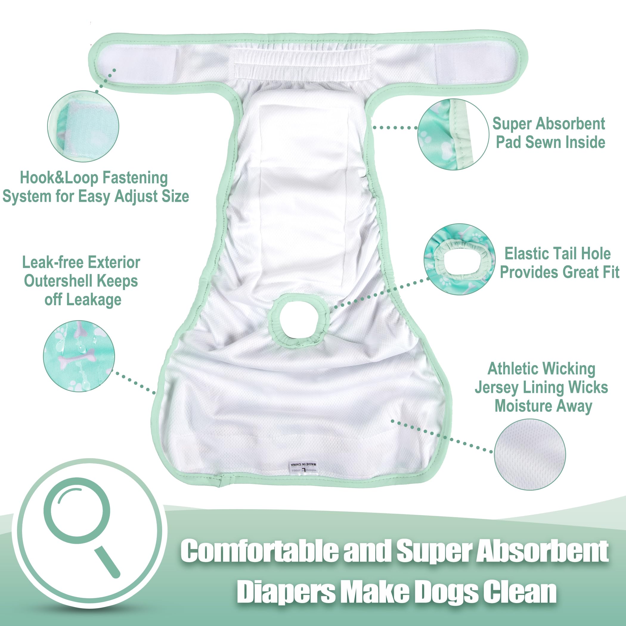 Washable dog diapers- Soft & Comfortable Diapers for Dogs - To increase your dog's comfort and acceptance our diaper wraps have no "crinkly" or uncomfortable texture that causes many dogs to dislike the ordinary disposable diapers. Hook & loop closures are quick and easy to put on and won't stick to your pet's fur.