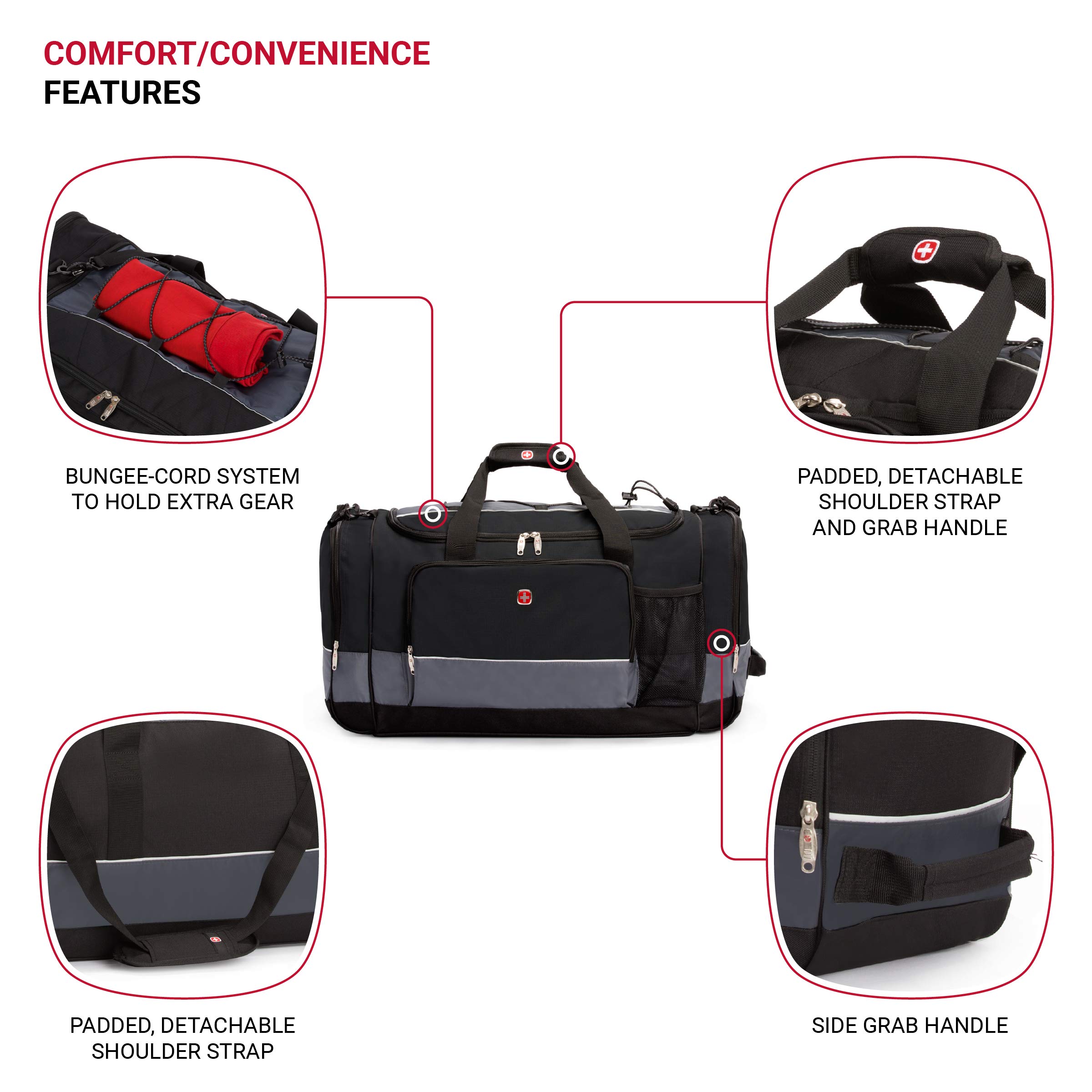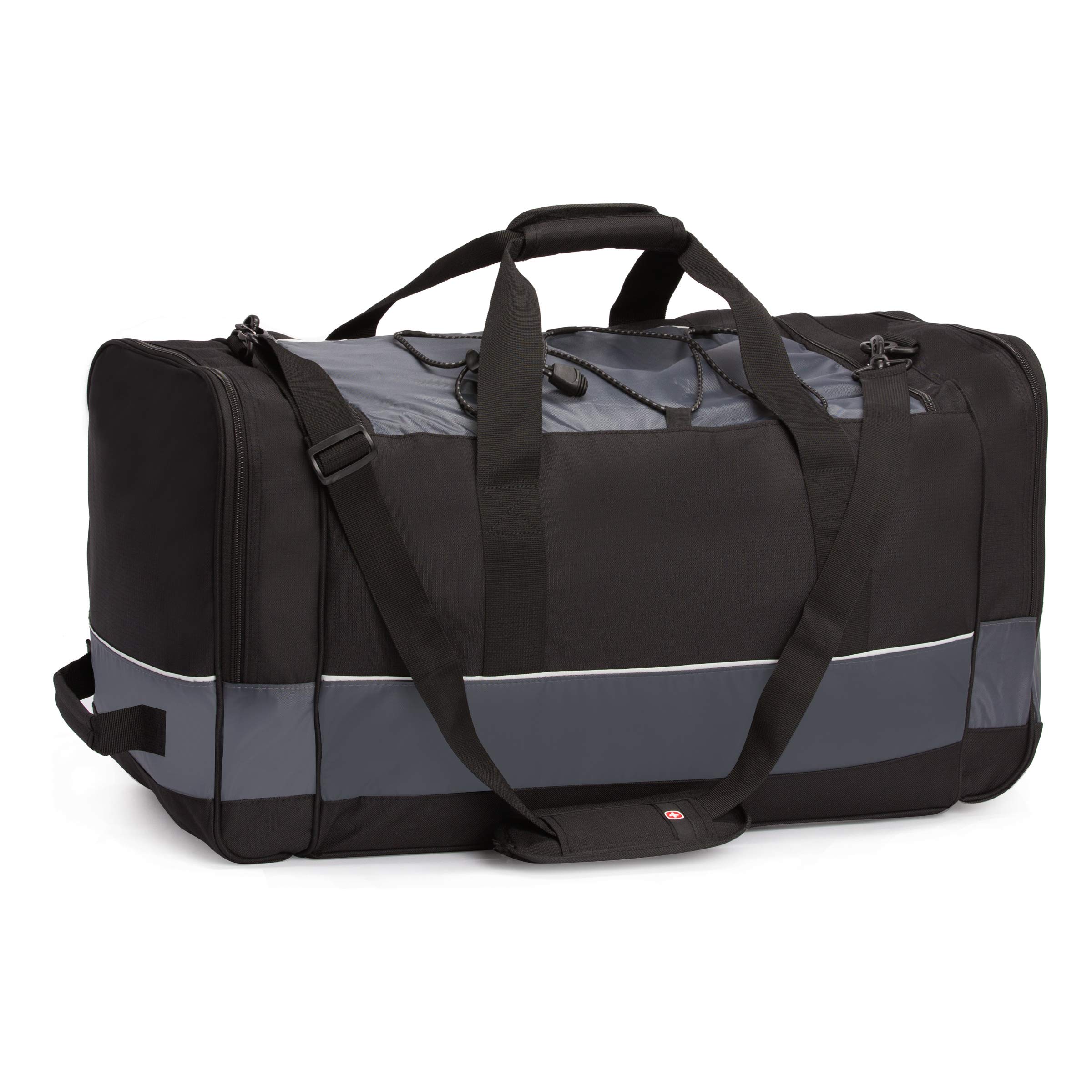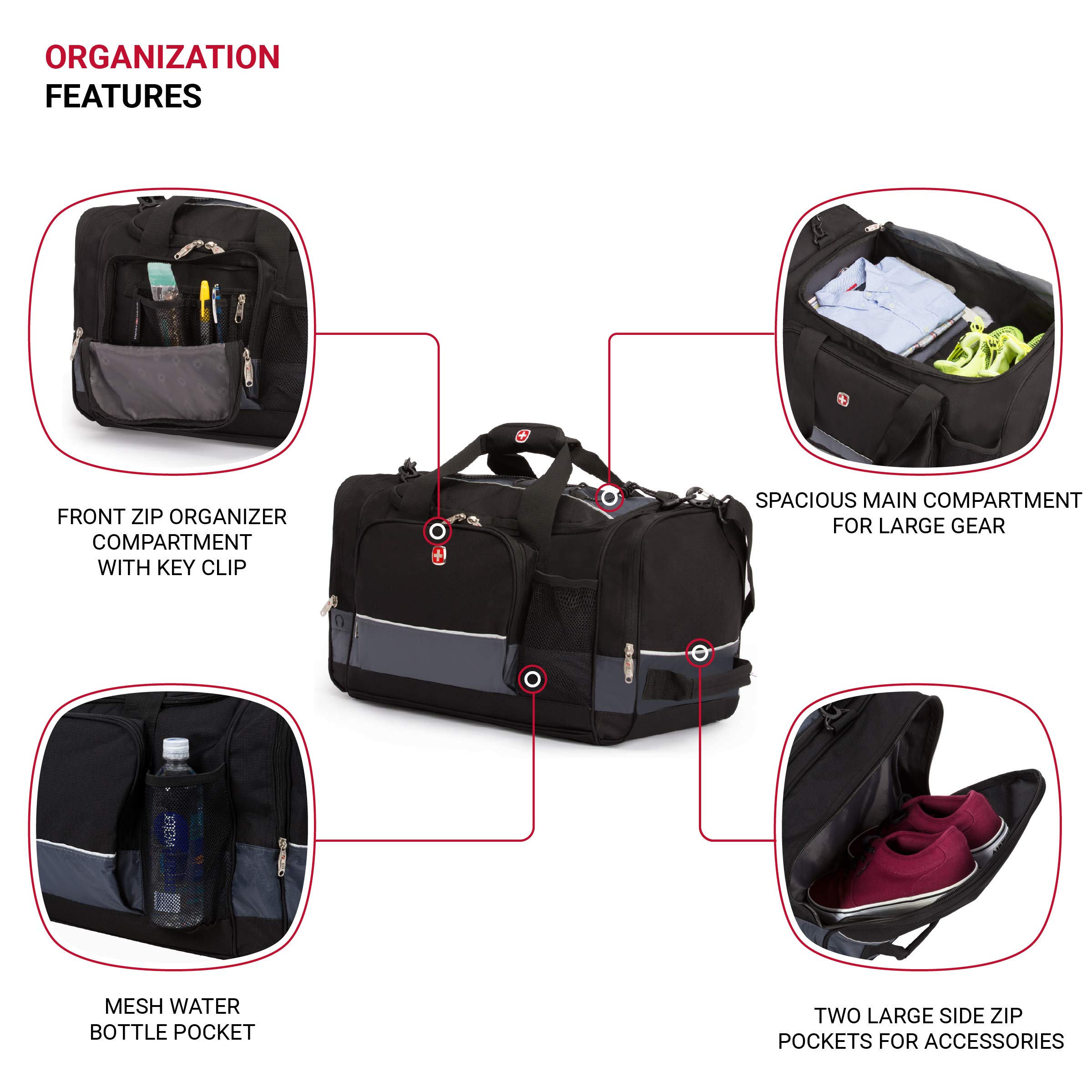 Description Are you looking for a reliable and spacious travel or workout bag? Look no further than the SwissGear Apex travel and gym bag for women and men. The perfect travel duffel bag for women and men, this rugged workout / weekend bag is made of durable, abrasion-resistant polyester made to withstand heavy use and harsh conditions. An ideal overnight bag for women and men, this packable duffle bag features a zipper closure and a large main compartment, 2 end pockets, and a front organizer pocket for storing writing utensils, snacks, and keys. Plus, it has a stretch mesh water bottle pocket to help you remain hydrated. The top bungee-cord storage system is perfect for quickly storing items, such as a light jacket or an umbrella. You can also lift and maneuver this workout / weekender bag for women and men using the reinforced top and side handles, or throw it over your shoulder with the removable, adjustable shoulder strap to enjoy hands-free mobility. The SwissGear Apex Travel Duffle Bag is the perfect solution for your travel needs. With this carry-on duffel bag, you can travel with convenience.