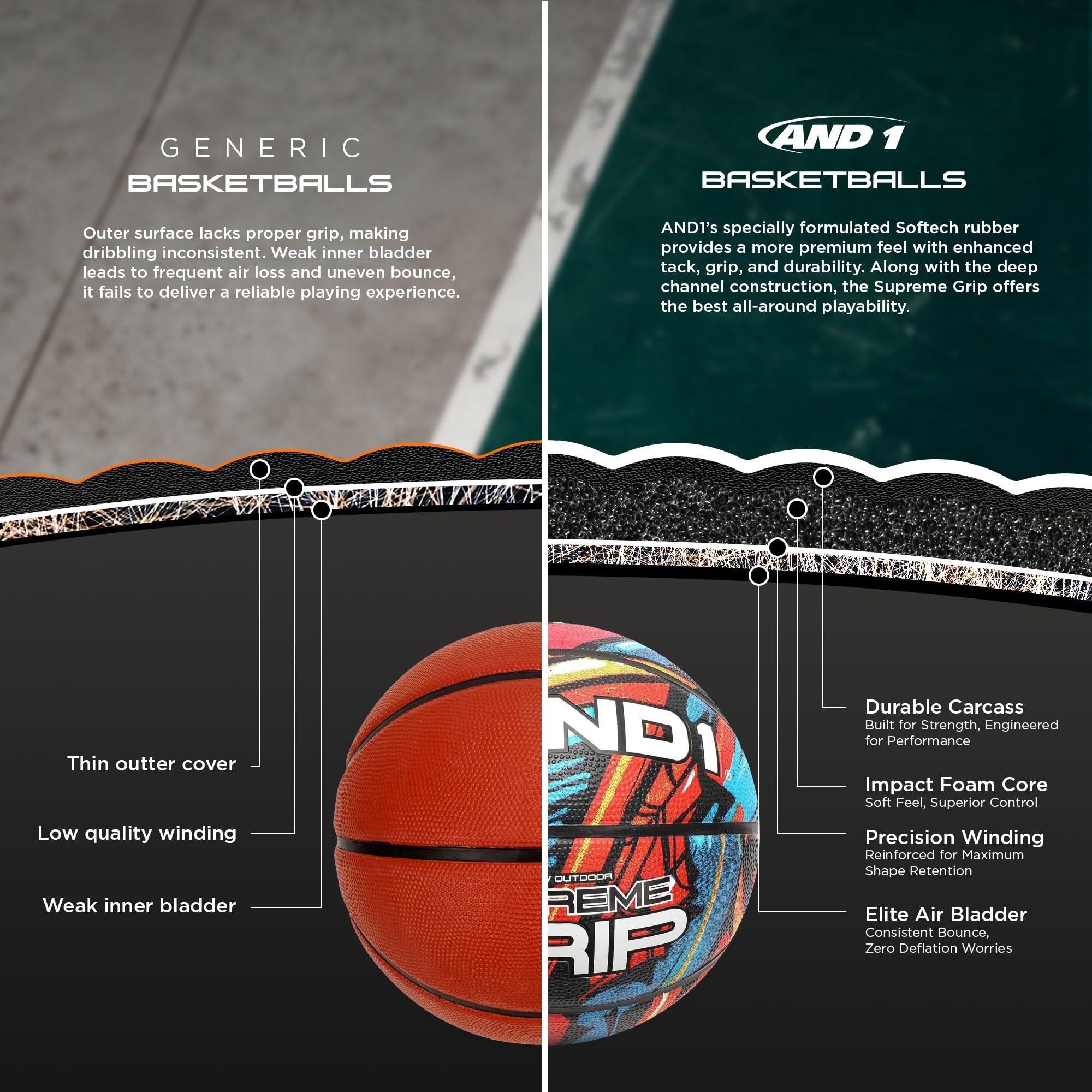 Deep Channel Construction: The AND1 basket ball has advanced deep channel construction that improves ball grip and control for dribbling and shooting.