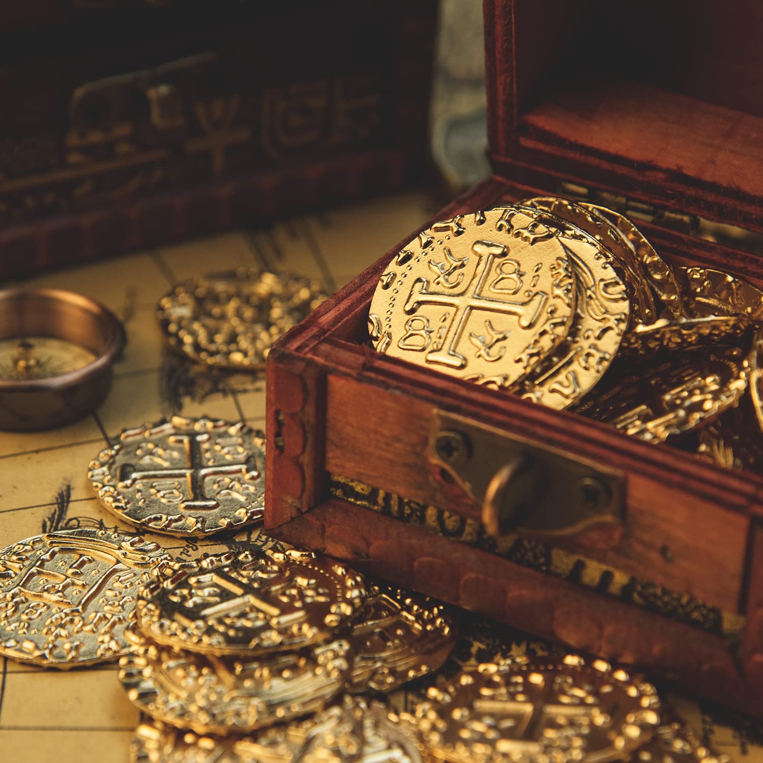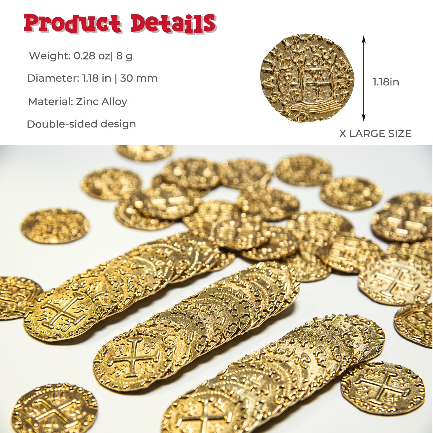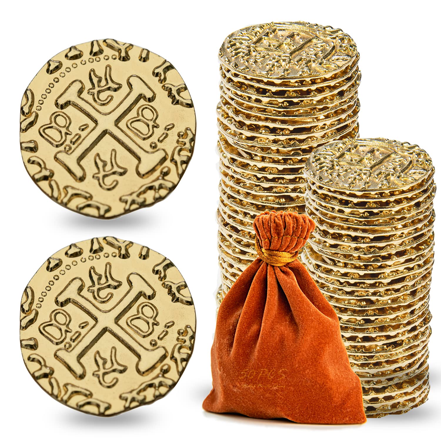 HEAVY AND BRIGHT - These Spanish Doubloon Replicas are made of zinc alloy, sturdy and resistant, fade, safe and non-toxic, can be kept for a long time. They feature a shiny gold surface. The exquisite vintage pattern is clearly carved on both sides of the coins.