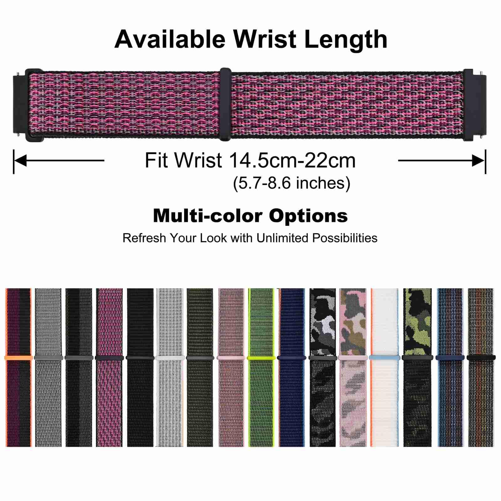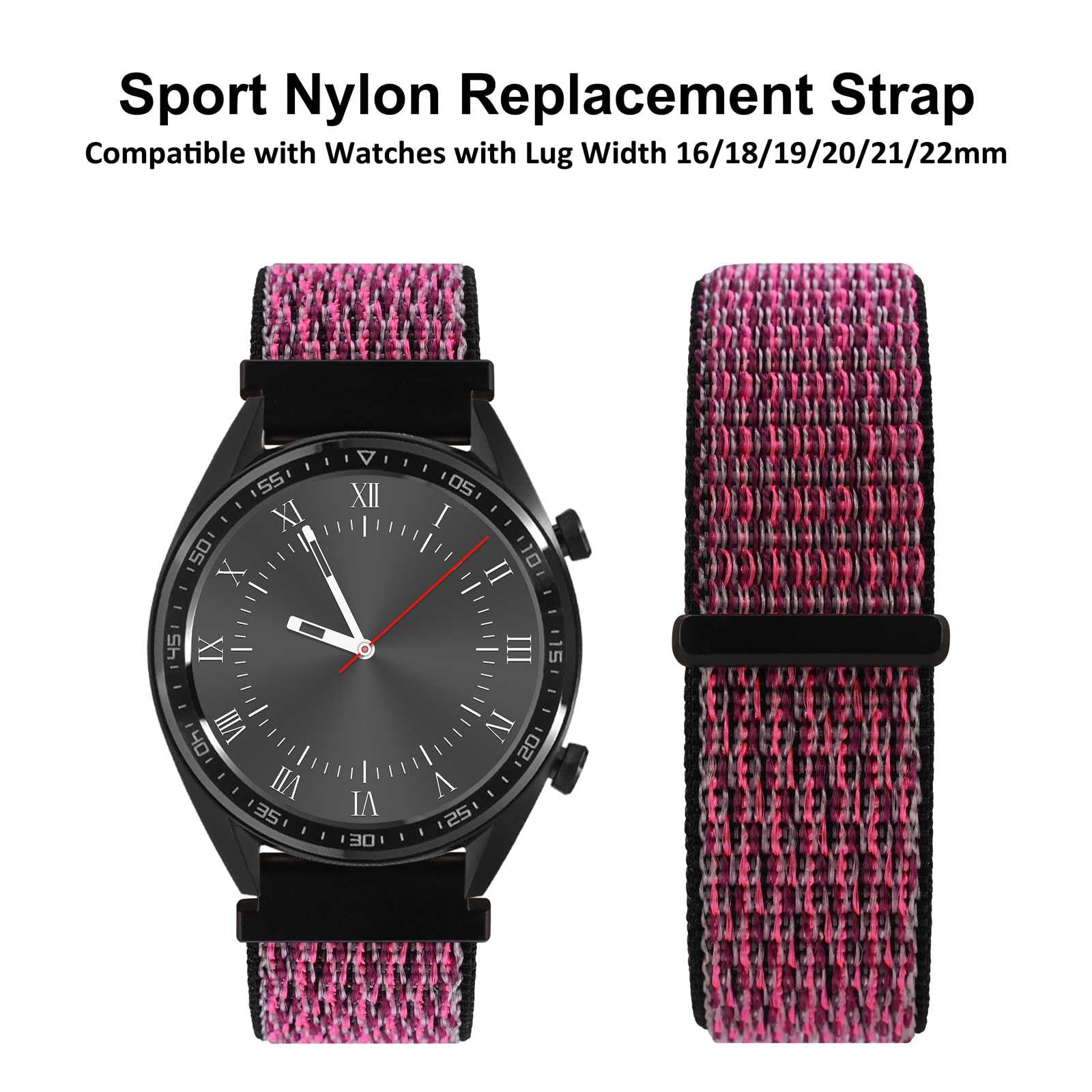 Band Width (Size): Standard 16mm, 18mm, 19mm, 20mm, 21mm, 22mm, 24mm. This watch band is compatible with all watches (including smart watches) with above band width. To determine the right size, use a ruler measure the interior distance between the two lugs on the watch case.