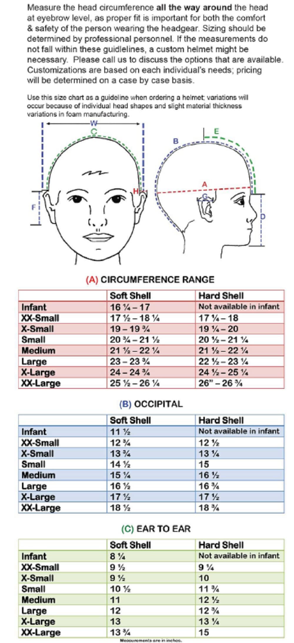 Medical helmet sizes range from children to adult