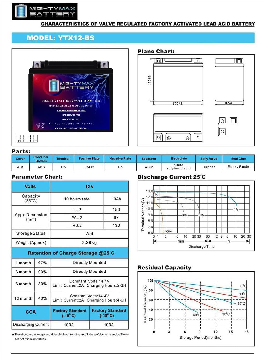 YTX12-BS is a 12V 10AH 180 Cold Cranking Amps (CCA) Sealed Lead Acid (SLA) Battery