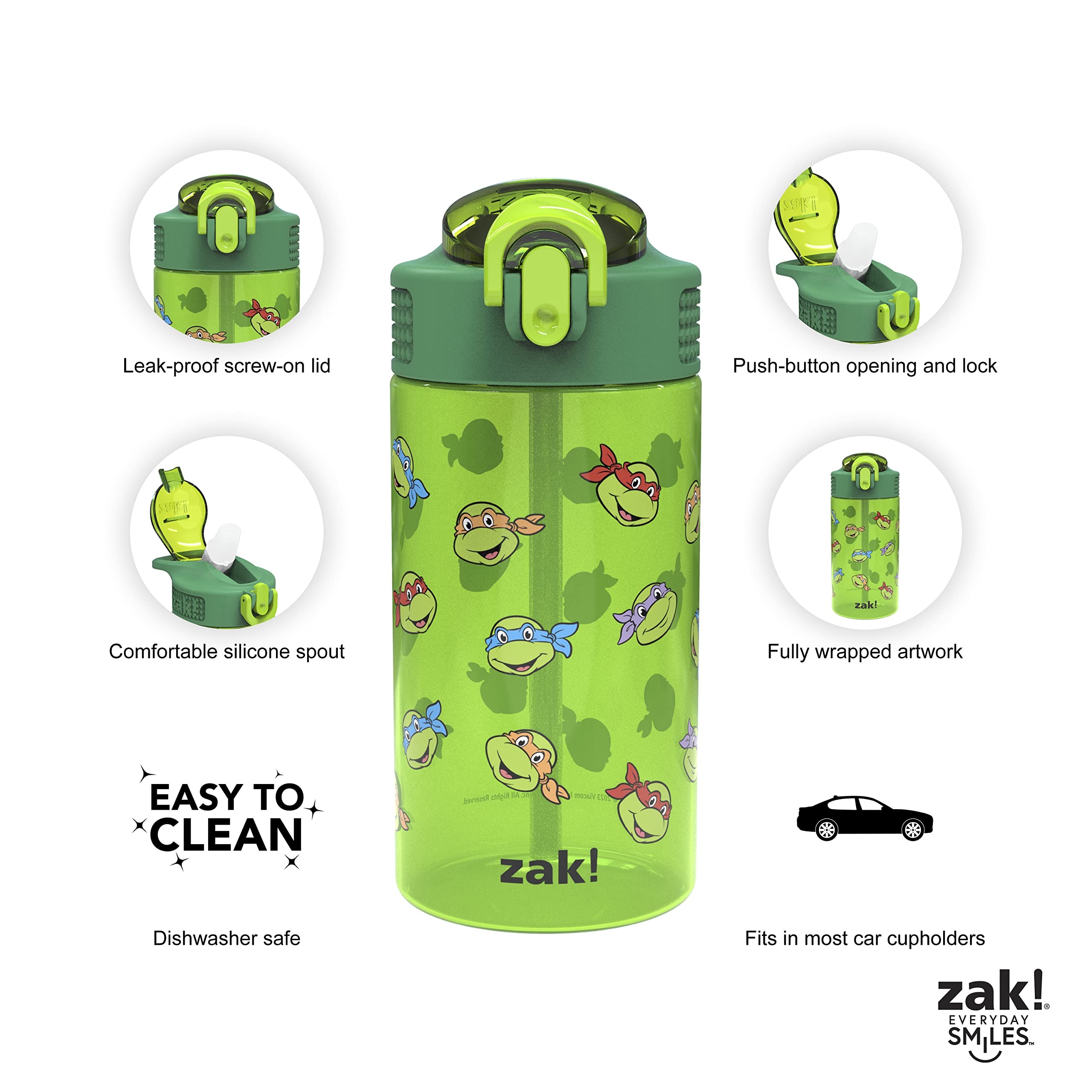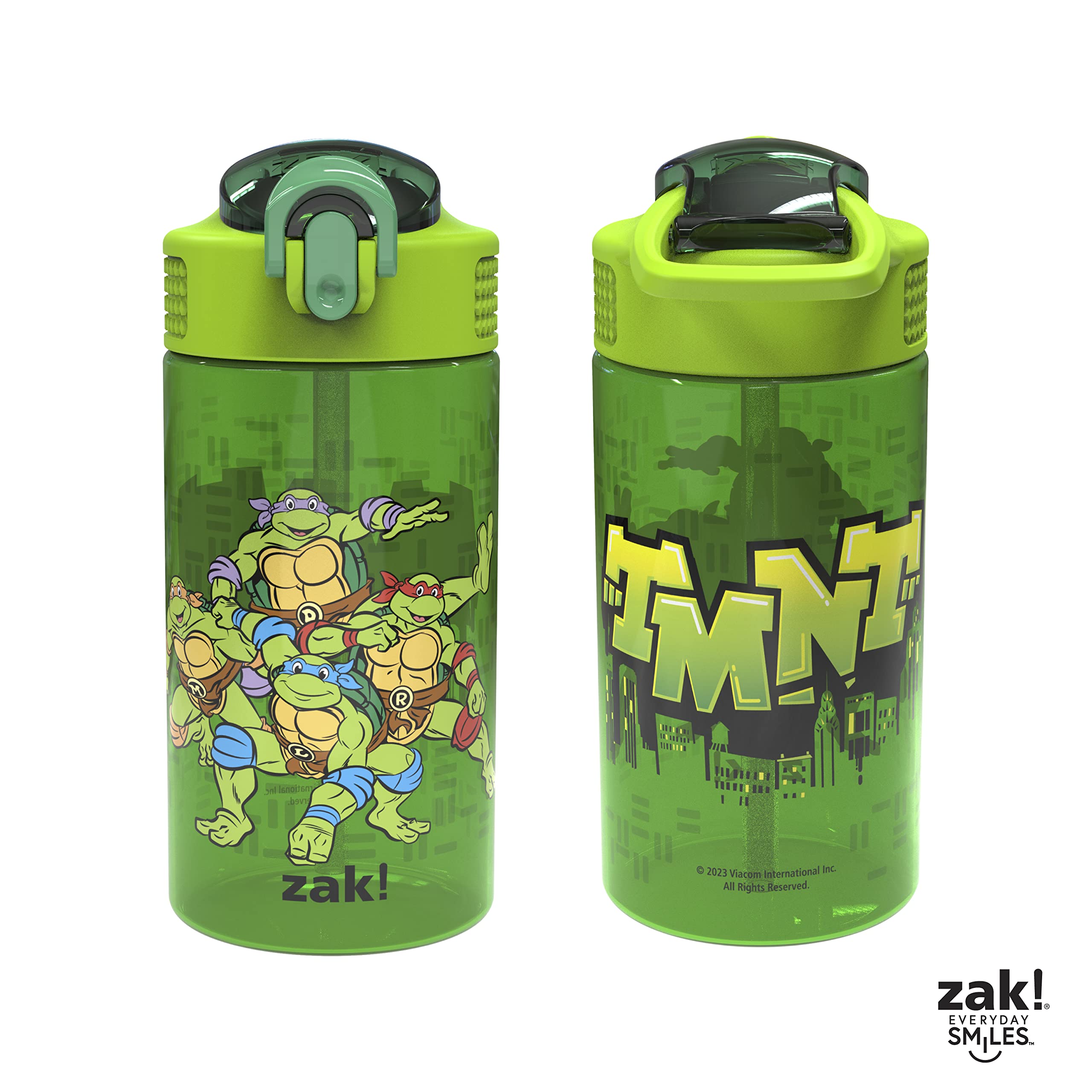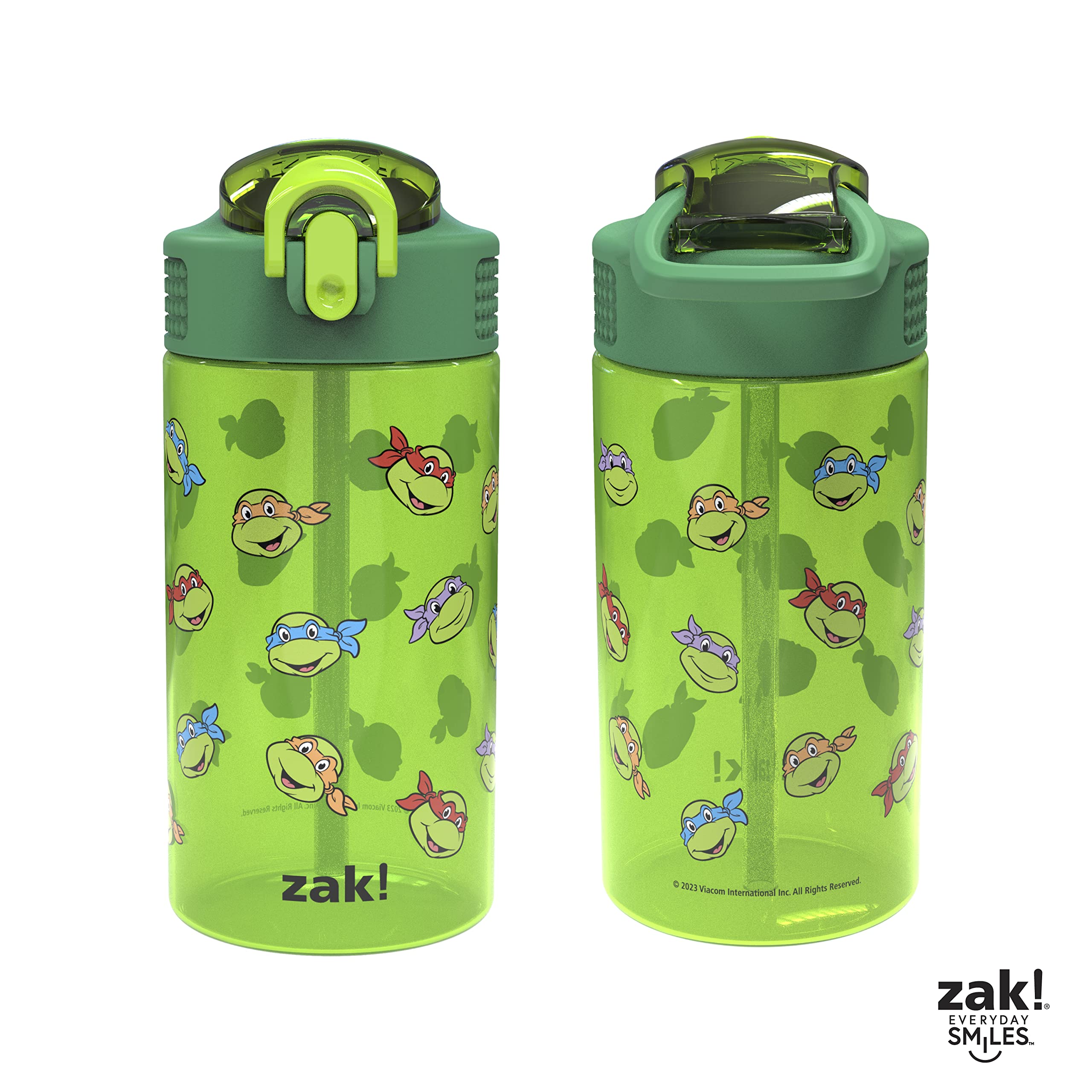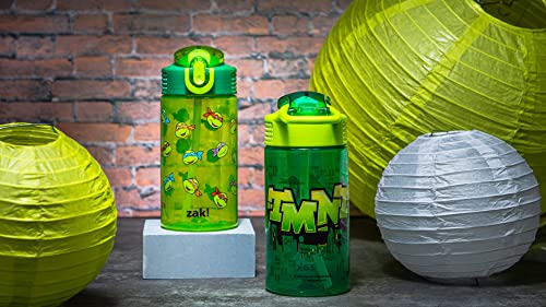 Let kids enjoy hydration with a fun water bottle by Zak Designs! Reusable and Durable Material: Reusable water bottles will last wash after wash—good news for you and the environment! The 16 oz water bottle is made of PP plastic, durable enough for kids to use every day and bring on any adventure. Leak-Proof Lid: The lid screws on securely and won't leak when the spout is closed, though water flows for easy drinking when the spout is open. The easy-open button has a flip-up lock to keep it from activating accidentally. On the Go: The water bottle has a built-in carrying loop on the lid for easy transportation, and with the spout cover to keep the spout clean and closed, it can be tossed into a bag for worry-free travel. Specifications: 2 bottles with 16 oz capacity. Made of durable plastic. BPA-Free - Zak is committed to safety. Dishwasher safe, do not microwave. Length: 4.23-inch, Width: 2.75-inch, Height: 6.61-inch. Character: Donatello, Leonardo, Michelangelo, Raphael (Teenage Mutant Ninja Turtles).