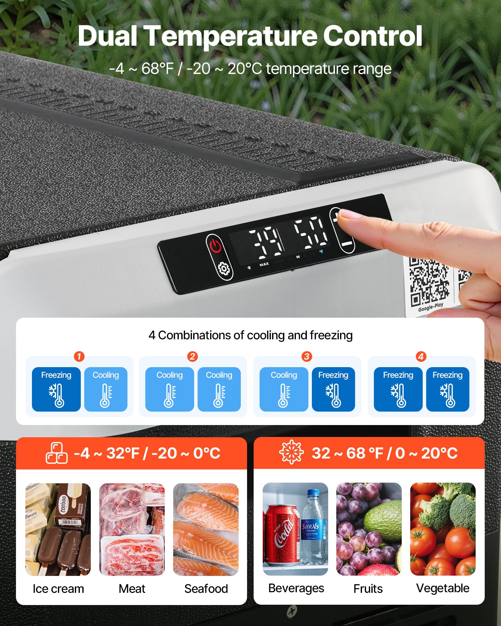 -4 ~ 68°F Temperature Range: The car refrigerator features an expanded temperature range of -4 ~ 68°F, allowing for both freezing (-4 ~ 32°F) and refrigeration (32 ~ 68°F). The dual-zone design allows you to freeze and refrigerate simultaneously