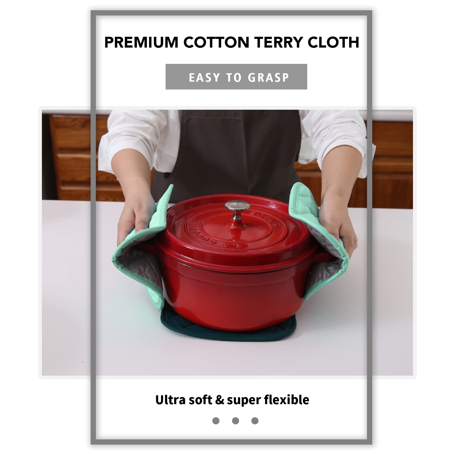 QUILTED AND PADDED - Heat resistant up to 400 degrees allowing safe removal of baking dishes and cast iron from the oven and hot pots from the stove.