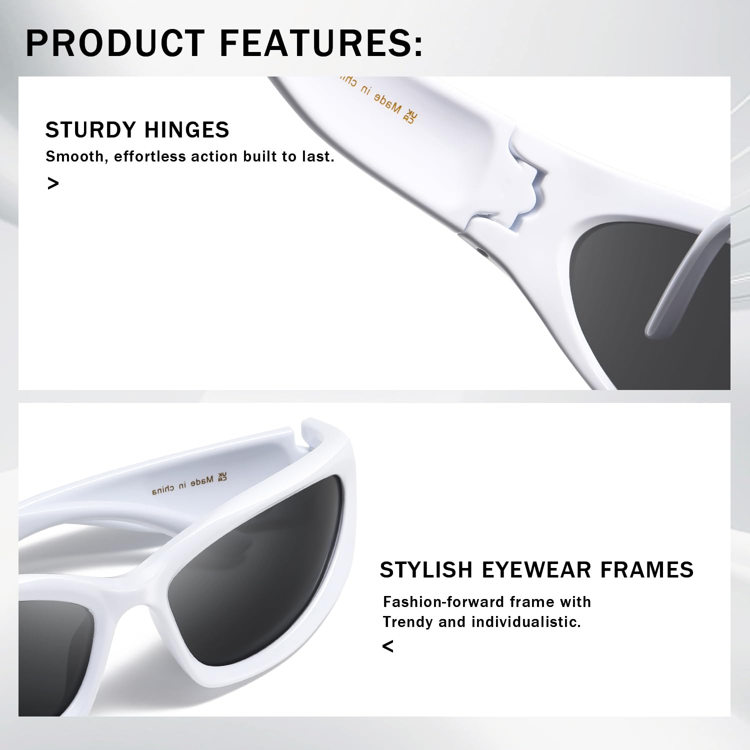 EXCLUSIVE DESIGN-We are dedicated to the development of trendy and unique sunglasses for people who pursue fashion and express their individualities,With retro wraparound eye shape,fit for all kinds of faces.