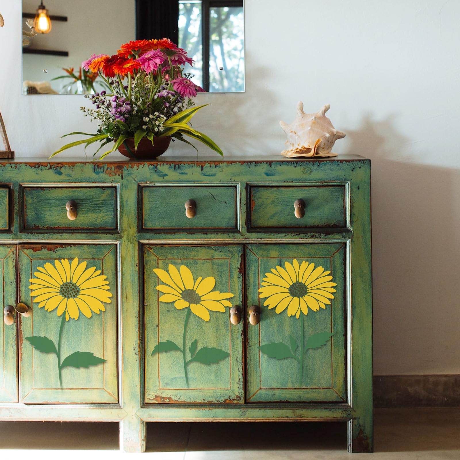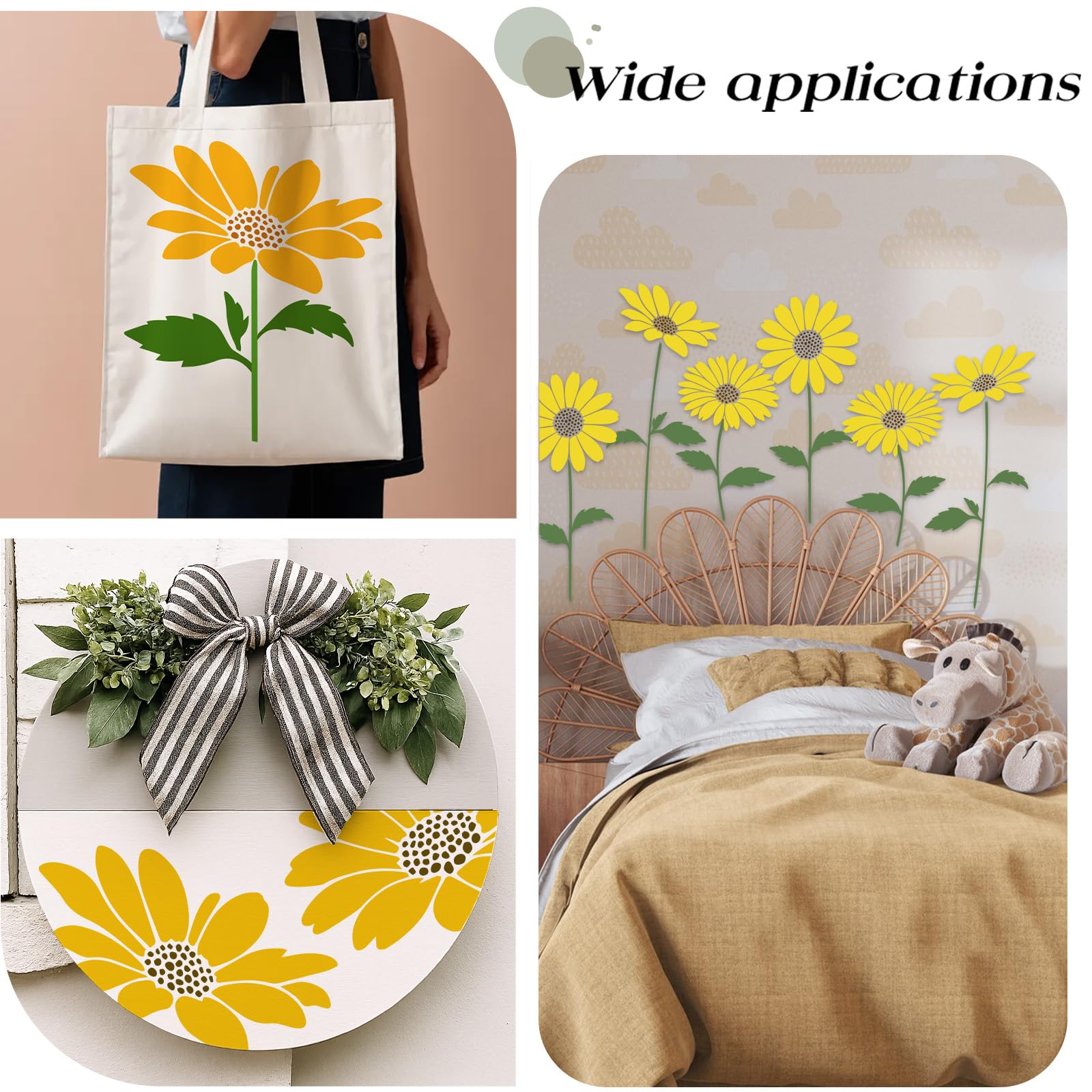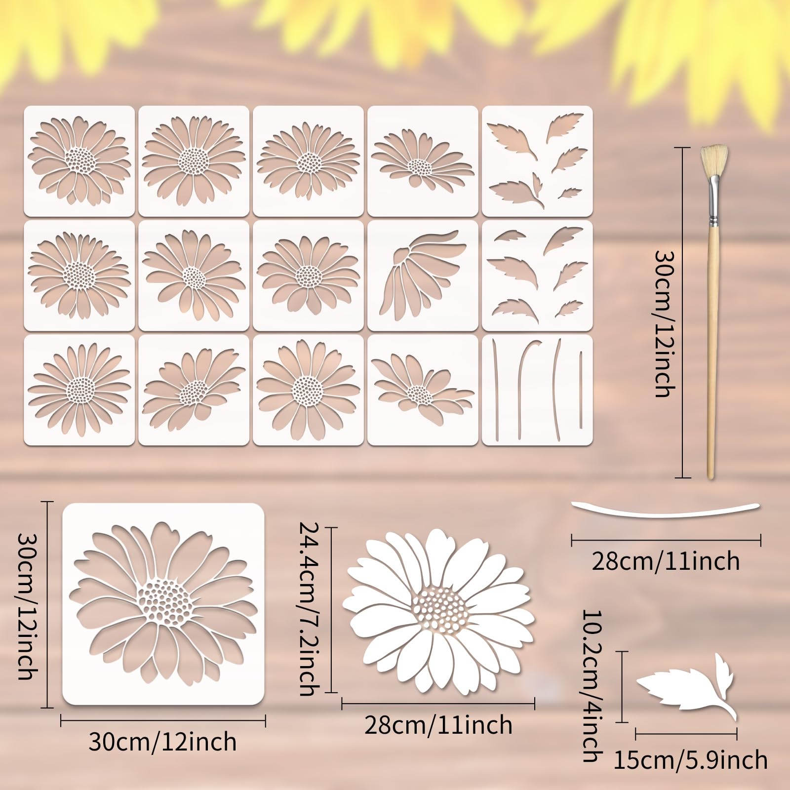 【Diversified Styles】The 15 PCS sunflower paint stencil include 12 different shaped flower stencils and 3 stem and leaf stencils in a variety of styles and shapes to create any DIY art project you wish, perfect for painting on wooden fences and garden gates