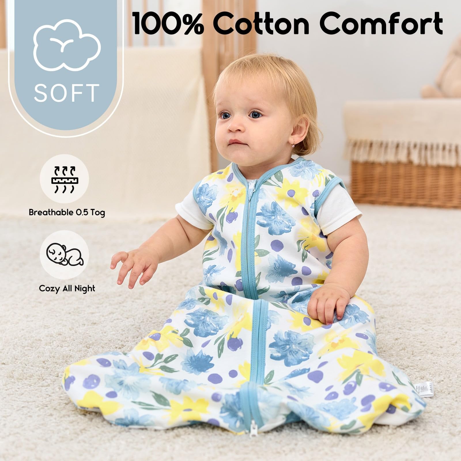Lightweight 0.5 Tog :The baby sleep sack 0.5 Tog is suitable for moderate temperatures from 75 to 80°F as an ideal option for spring, summer, autumn or taking a nap in air-conditioned rooms.We insist on quality control of baby wearable blanket, it can be withstand millions of washes and achieve a shrinkage rate of less than 2% after machine washing and dry on low heat (<30°C/86°F).