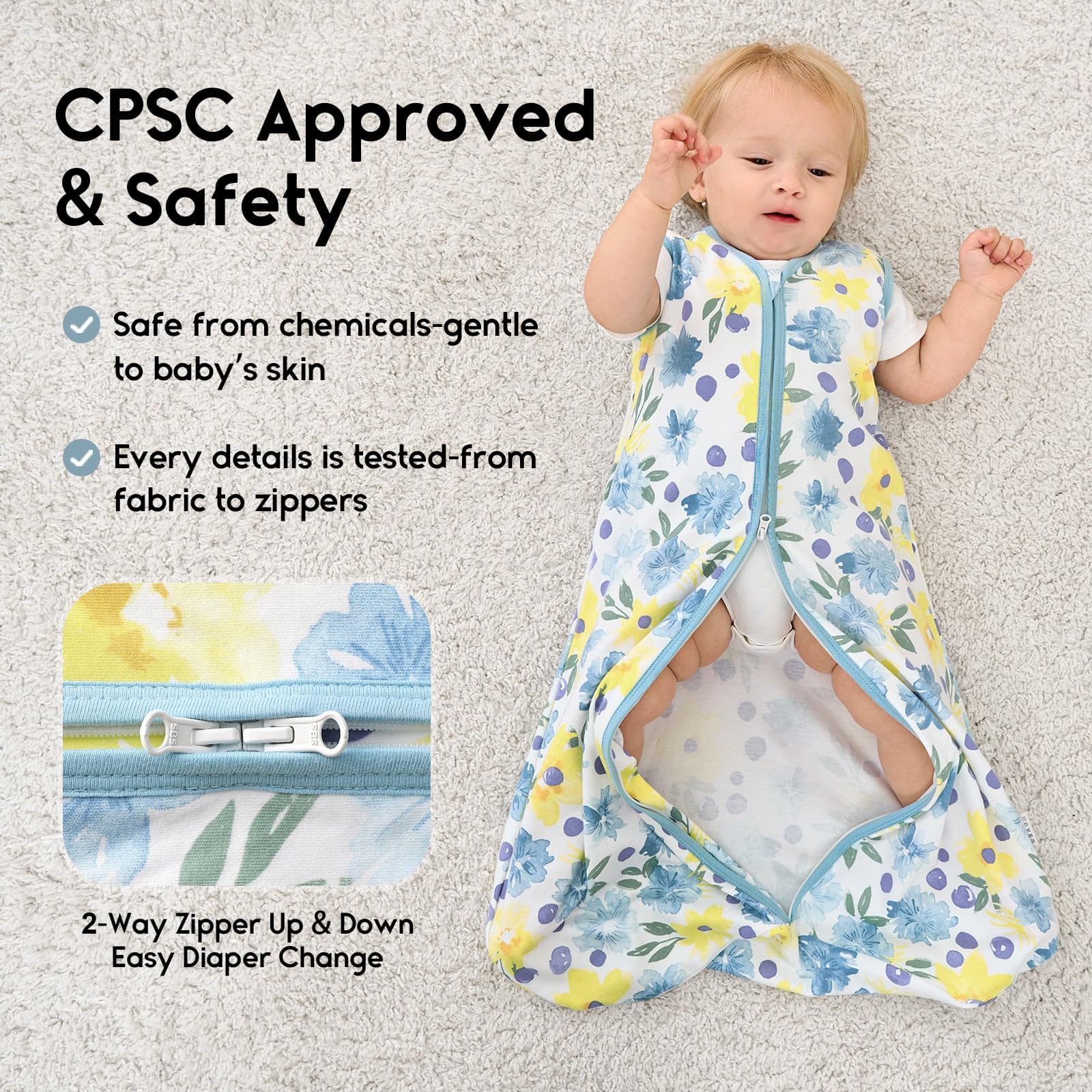 Smooth Double Zipper - Our wearable blanket baby feature a 2-way zipper, so you can unzip from the bottom to to change diapers, disturb baby even less during the night. Then you can enjoy a sweet night with little one ! Zipper protectors on the top will protect baby's jaw from scratches.