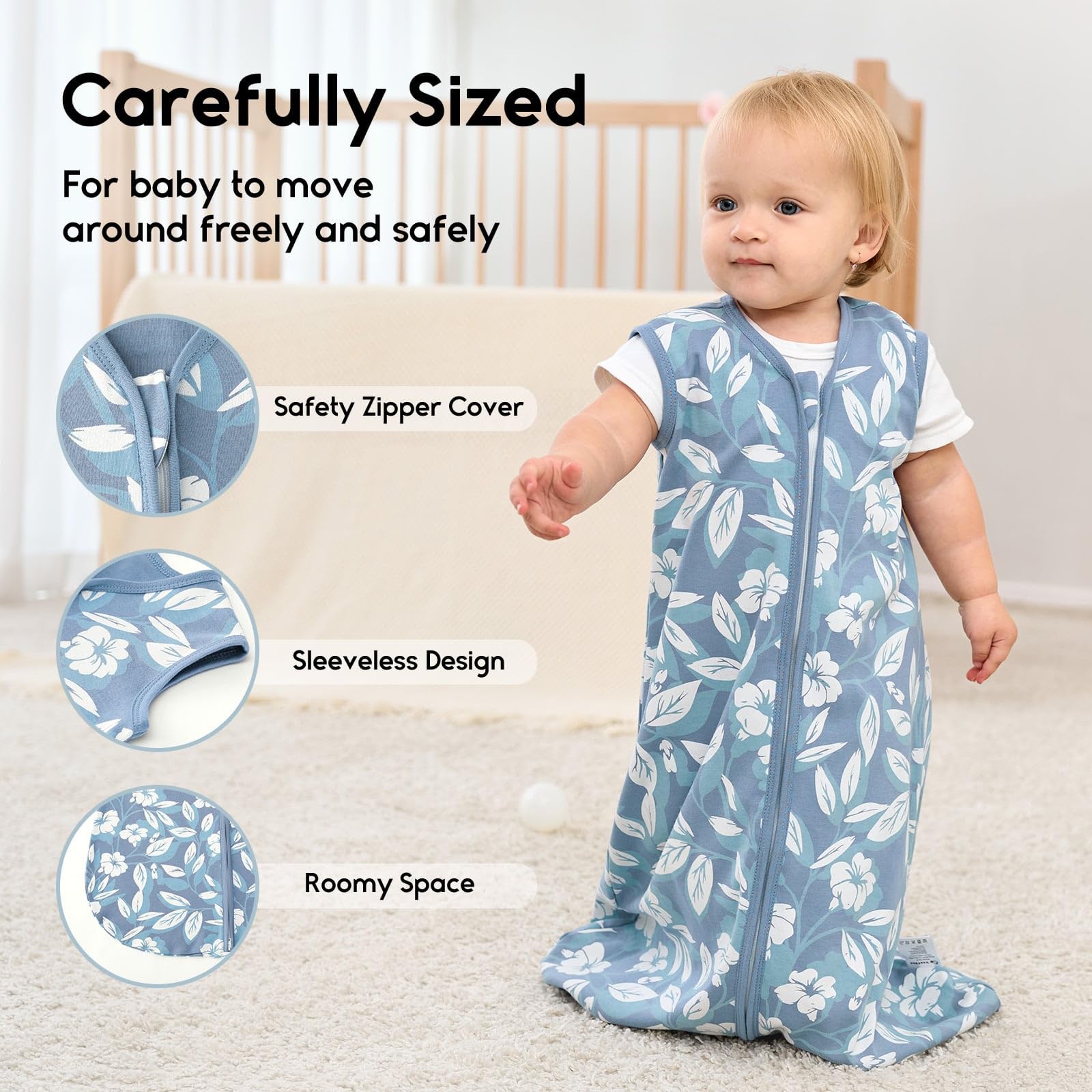 100% Organic Cotton Comfort - This baby sleep sack made with 100% Organic Cotton, super soft and breathable for comfort. The sleeveless design helps regulate baby's temperature, reducing overheating risk and ensuring warmth and cozy.