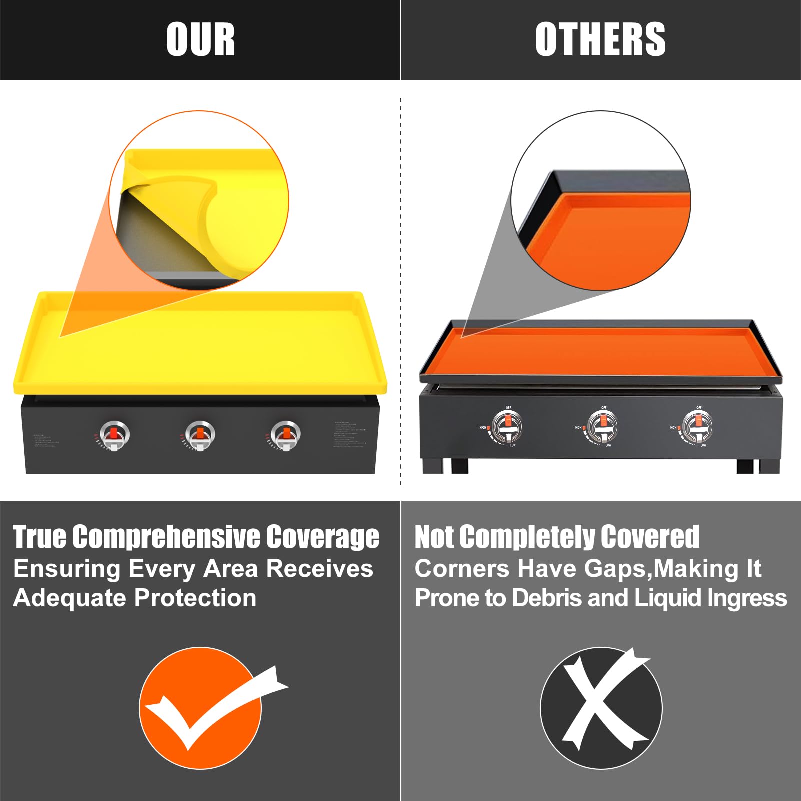 【FULL COVERAGE DESIGN】: Unlike other blackstone griddle mat that leave gaps in the corners, our innovative silicone griddle mat provides full coverage, ensuring every inch of your cookware is fully protected from pesky pollen, leaves, and more.