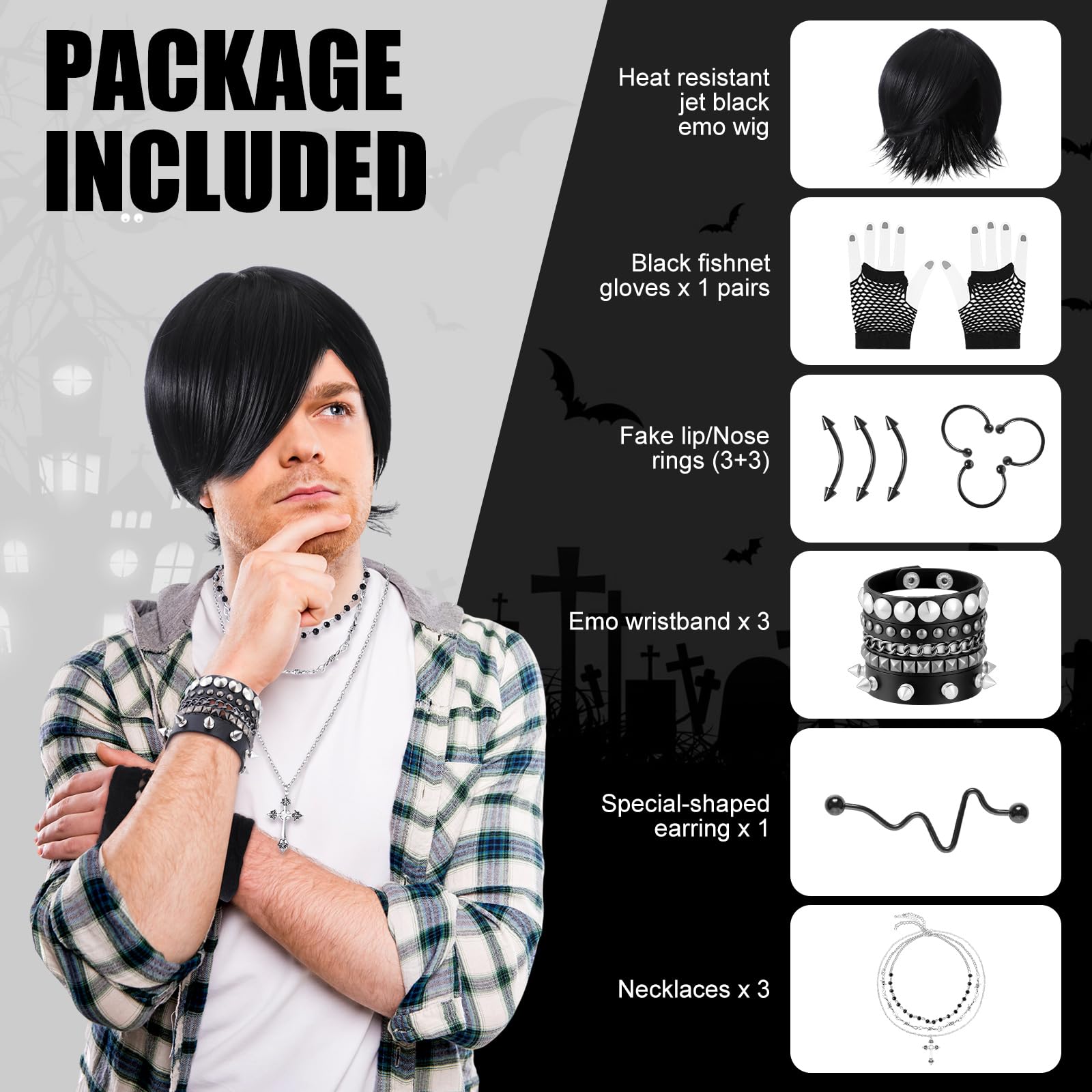 Complete Emo Costume Set: this 13 Piece Emo Accessories Kit Includes Everything for an Authentic 2000s Punk Look: black emo wig, cross necklace, studded wristbands, fishnet gloves, plus 6 fake piercings (nose/lip rings) and earrings; No additional purchases needed