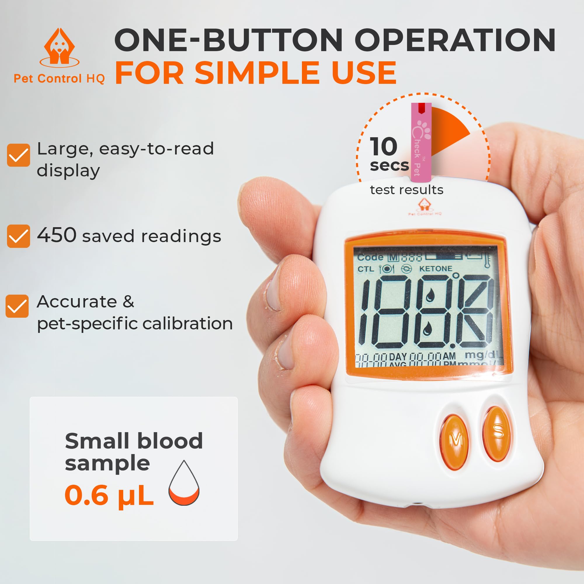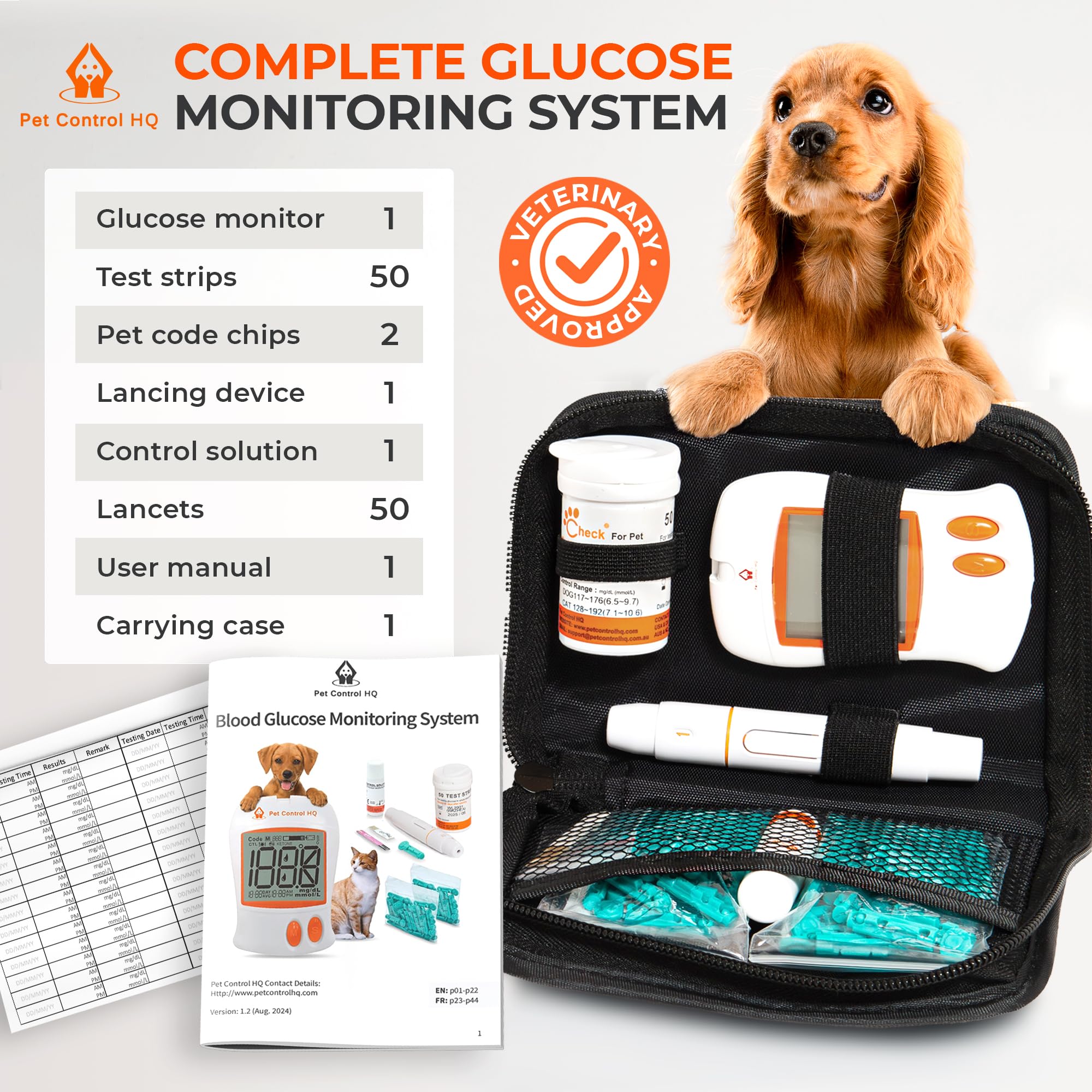 Complete glucose monitoring system: The Pet Control HQ glucose starter kit includes everything you need to start accurately monitoring your dogs' and cats' diabetes. This starter kit contains a glucometer, 50 blood glucose test strips, 2 code chips (one for dogs and one for cats), 50 Lancets, a Lancing Device, a Control Solution, a Carrying Case, Logbook, User’s Manual, Quick Reference Guide