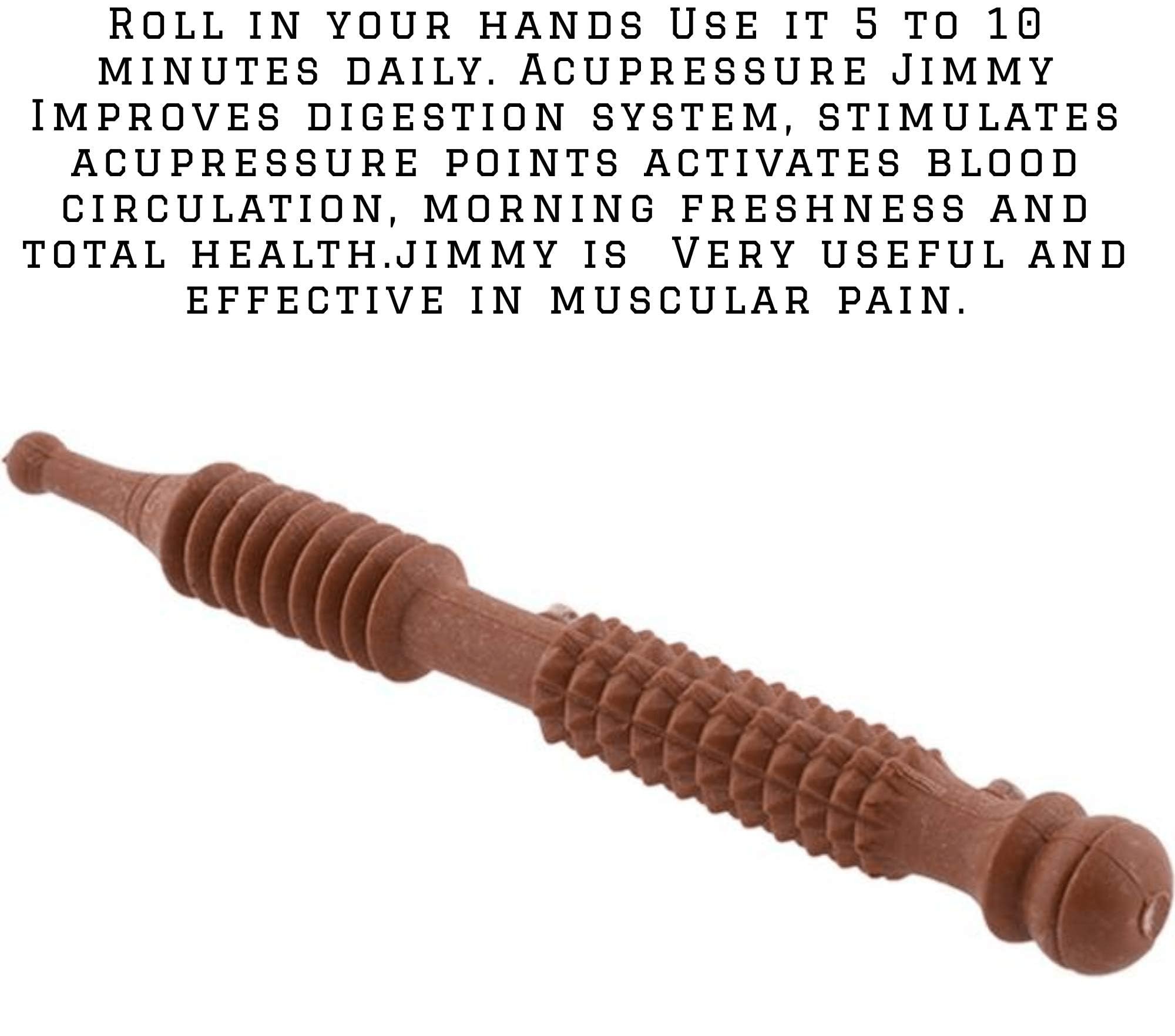 Wooden jimmy or small stick with spikes is a tool used in acupressure therapy to stimulate pressure points on the body . Points can be located as per the chart which is included in the kit