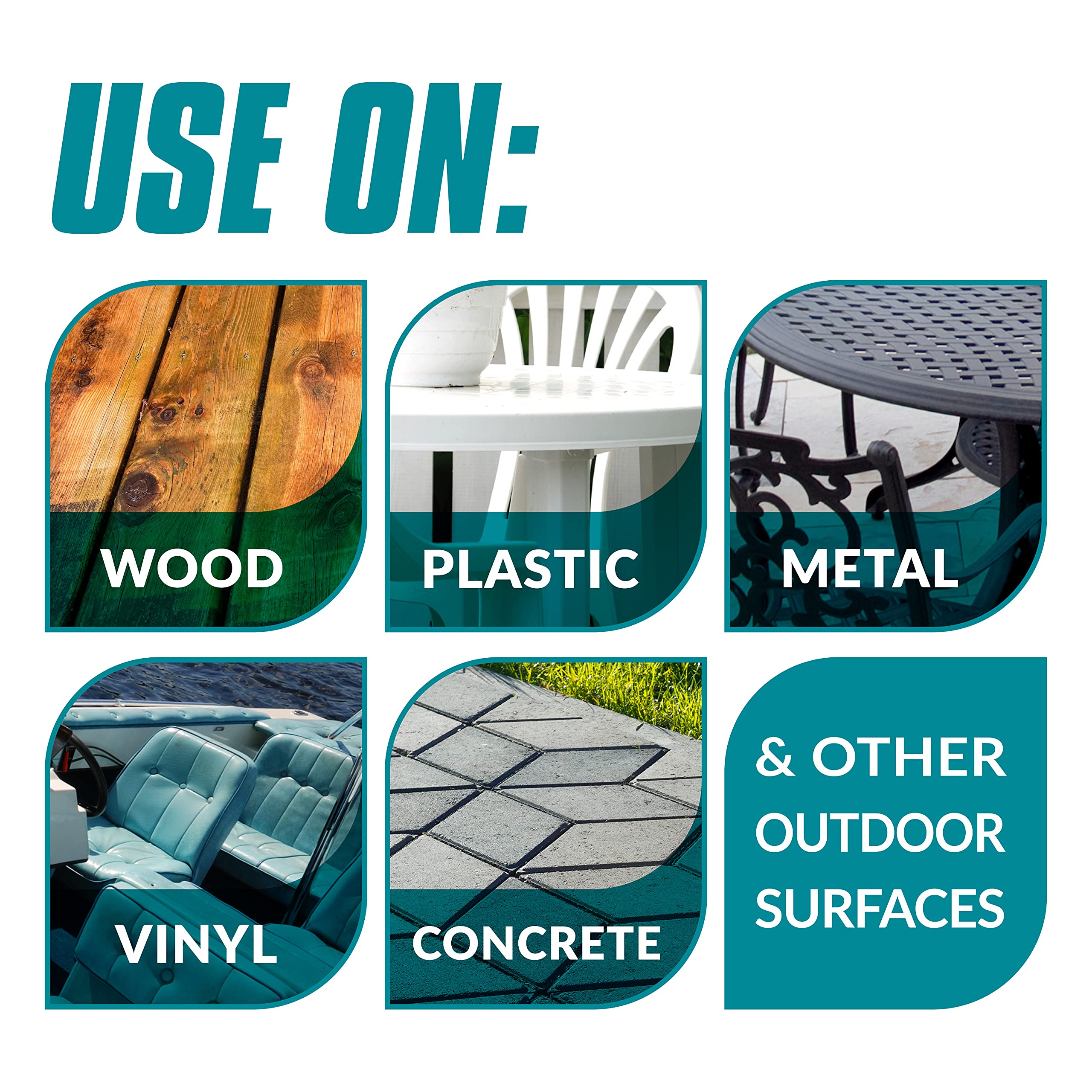 Cleans a wide variety of surfaces such as wood, composite, vinyl, metal, fabric, plastic, wicker, concrete, stone, brick and asphalt