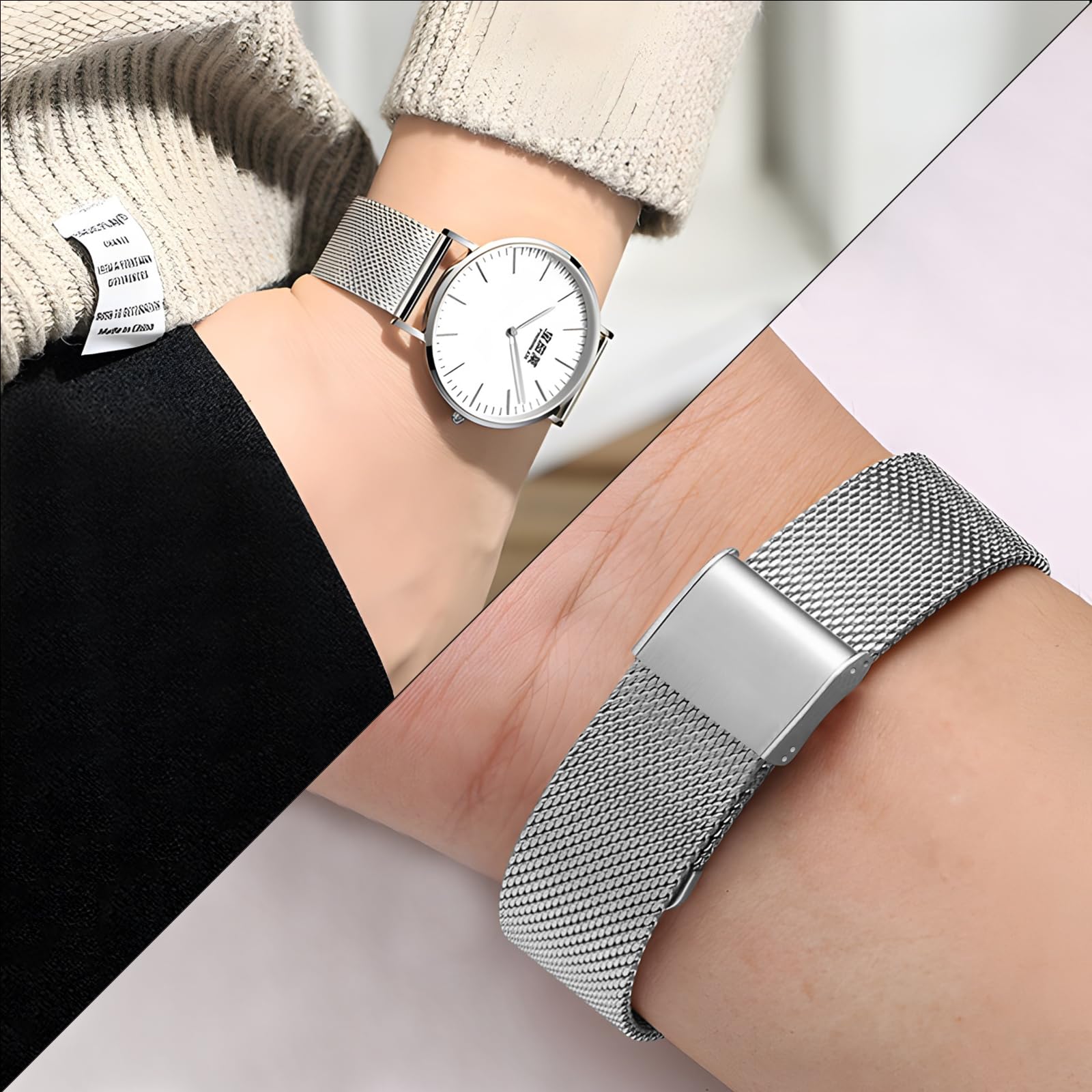 BREATHABLE AND COMFORTABLE: The surface of this watch is woven with mesh. It has tiny holes on its surface, which will not cause skin to sweat and lack oxygen when worn, keeping it fresh and breathable at all times. The cold touch of the mesh stainless steel strap and its finely polished surface are very smooth and silky, making it very comfortable to wear.