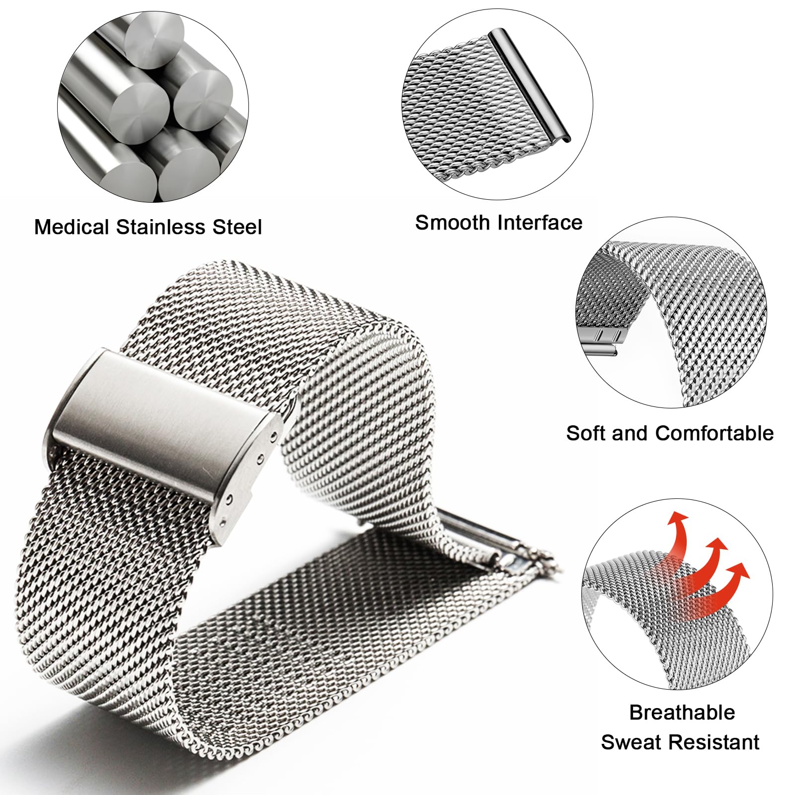 PREMIUM MATERIAL: This watch band is made of high-quality stainless steel mesh, finely polished, and has no sharp edges at all. The surface is smooth and safe. At the same time, it is corrosion-resistant, lightweight, and waterproof. It can be used for a long time.