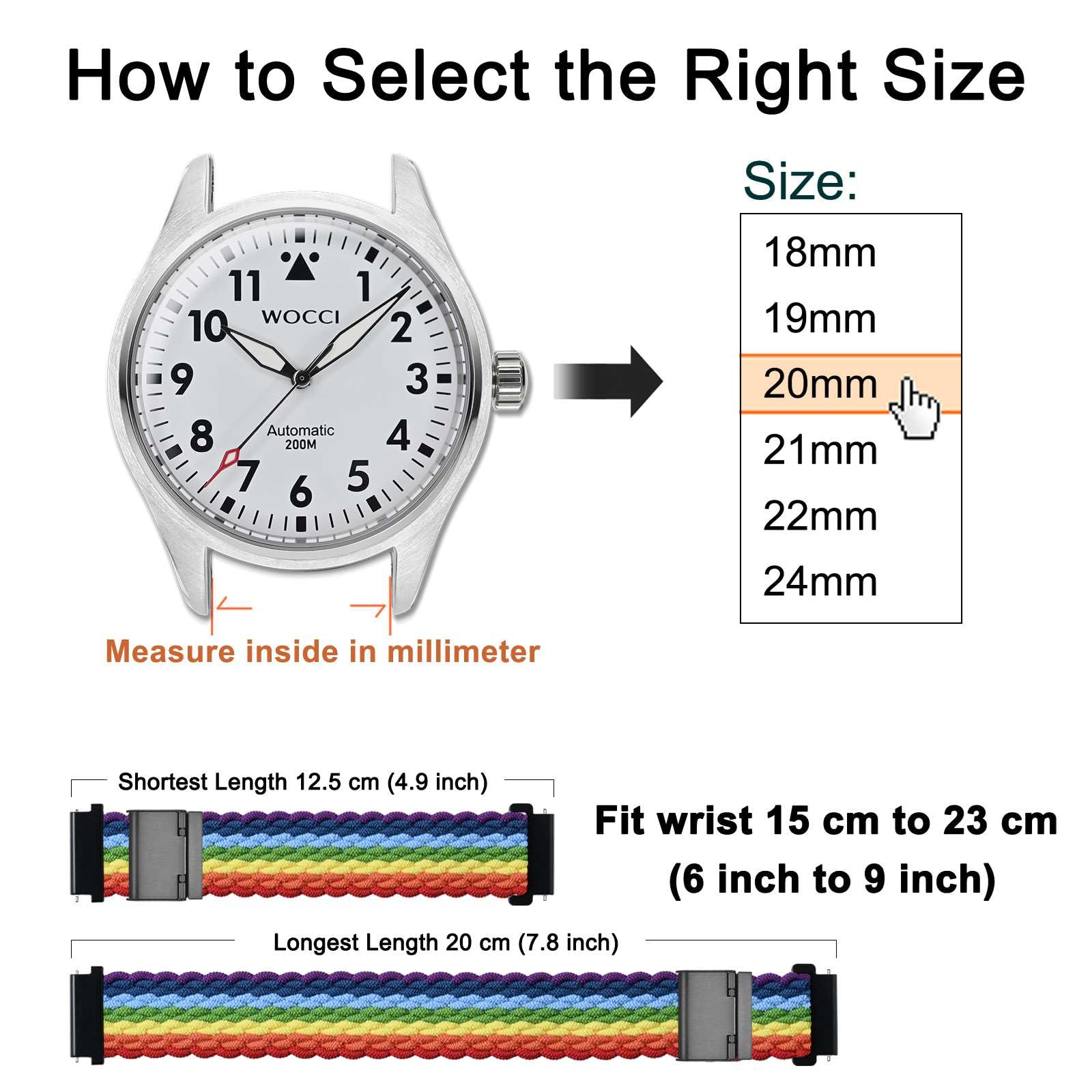 Select Band Width (Size): 16mm 18mm 19mm 20mm 21mm 22mm 24mm. Compatible with most traditional watches and smart watches which lug width is standard 16 18 19 20 21 22 24 millimeters. In order to get a suitable strap, please measure inner distance in millimeter between two horns on your watch.