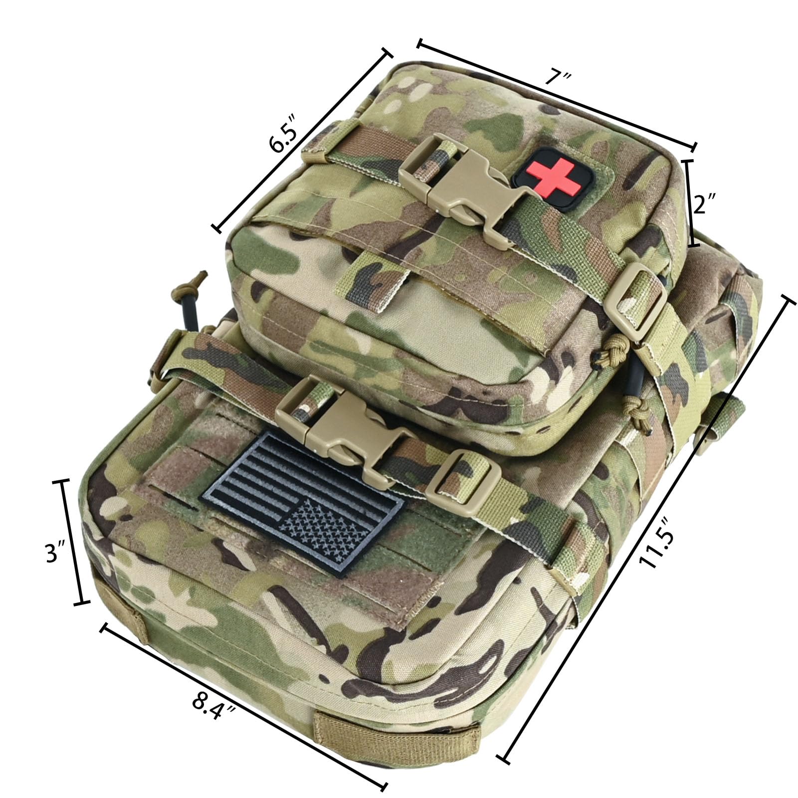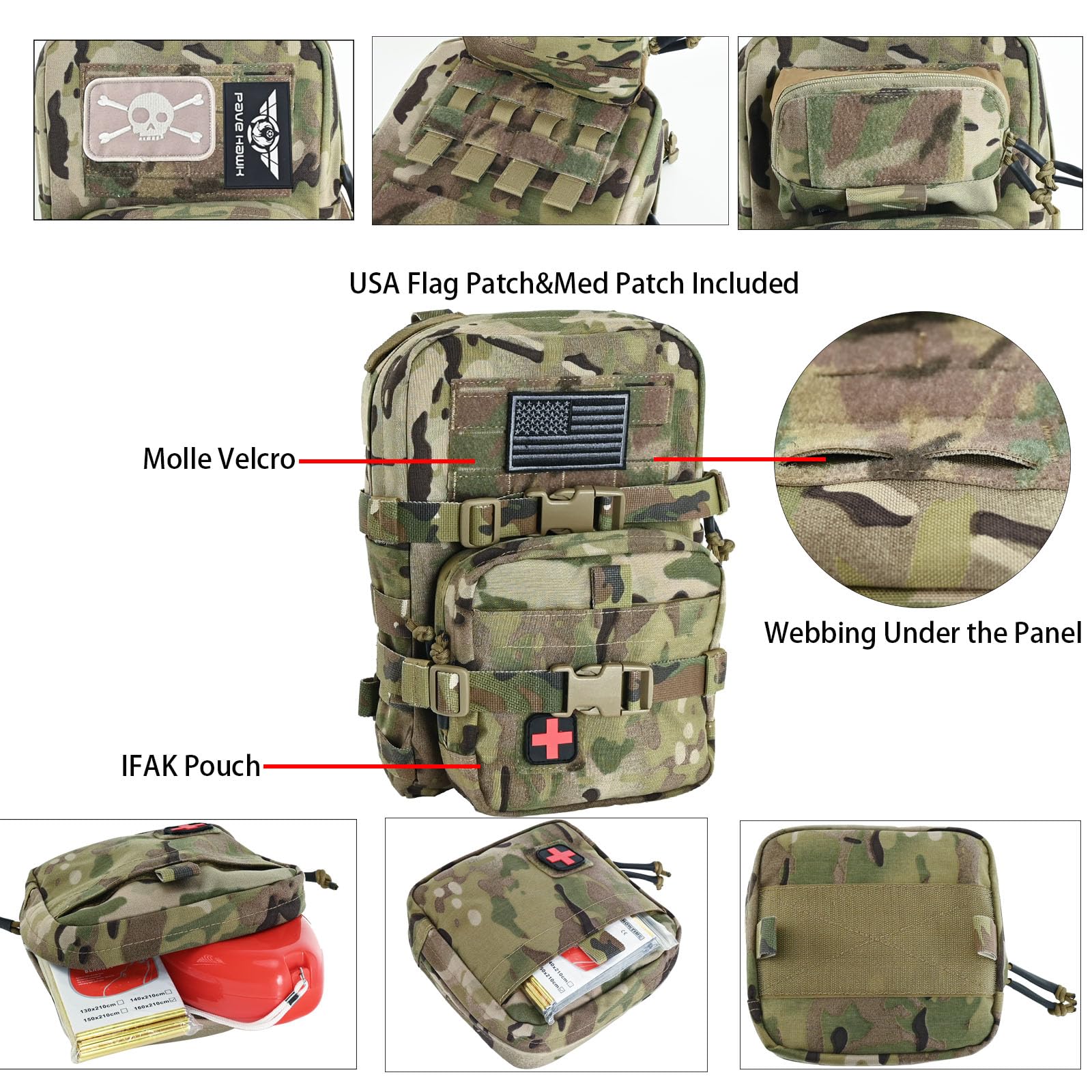 [Hydration Pack Compatible]:The tactical hydration pack has two molle webbing on the back,which it can be attached to your tactical vest/tactical backpack/Plate carrier/Chest Rig and other molle accessories, very suitable for outdoor sports, climbing, hiking.There is a small medical Pouch in front of the water backpack,and the back of the ifak bag uses hook&loop to stick the water backpack,very easy to tear off and open it, also can store tourniquets/hemostat/shears/NPA,OPA