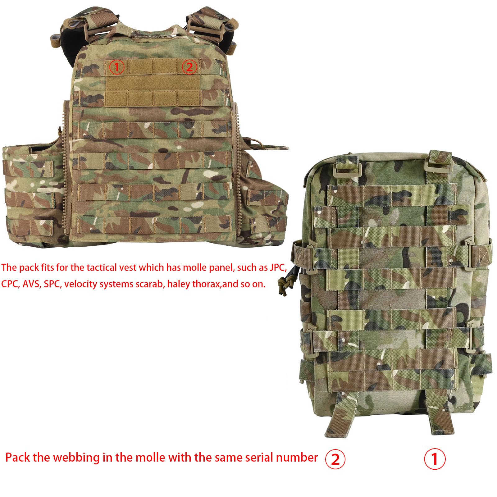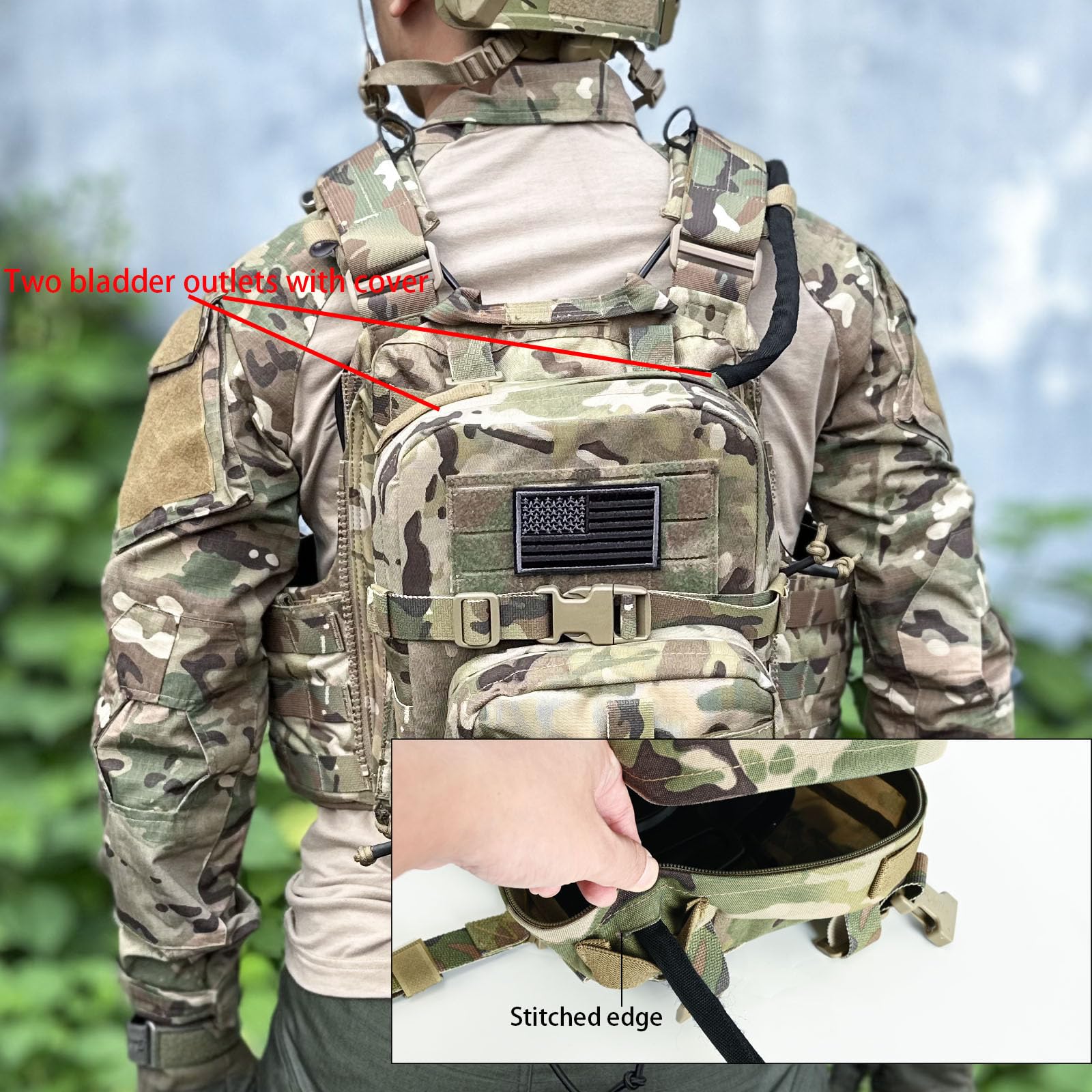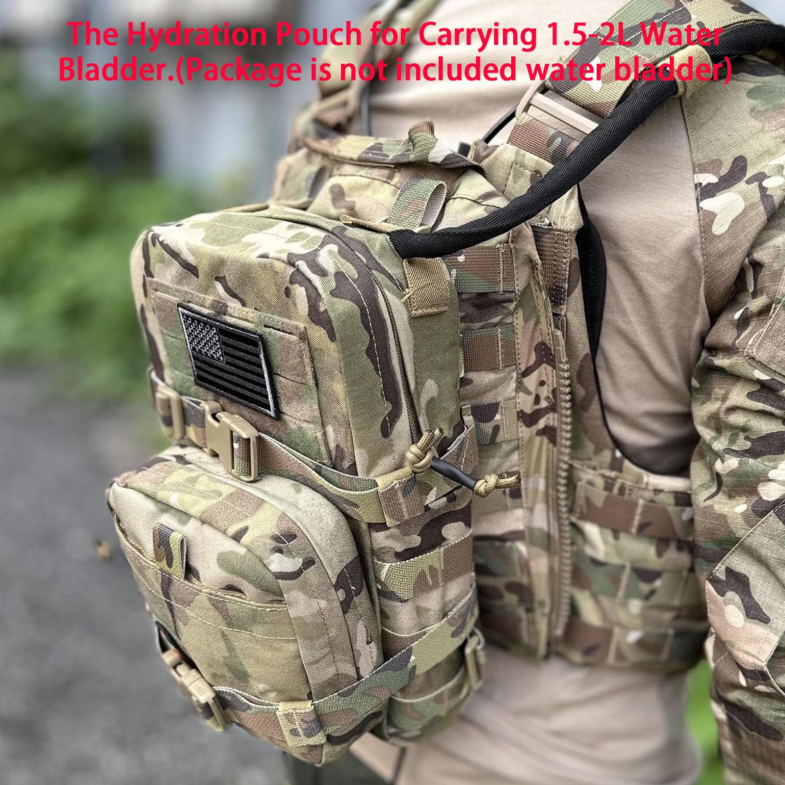 [Tactical Molle Hydration Pack&Hydropack]: A spacious main molle hydration pouch for carrying 1.5-2L water bladder.Please note that this carrier doesn't contain water bladder.Two bladder outlets with cover with protective on the hydration backpack top,so the water pipe can be changed the position to left or right side at anytime.Features a hook&loop molle panel on the front of the pack which uses webbing under the panel to make it more practical to carry molle admin pouch/phone holder/EDC pocket