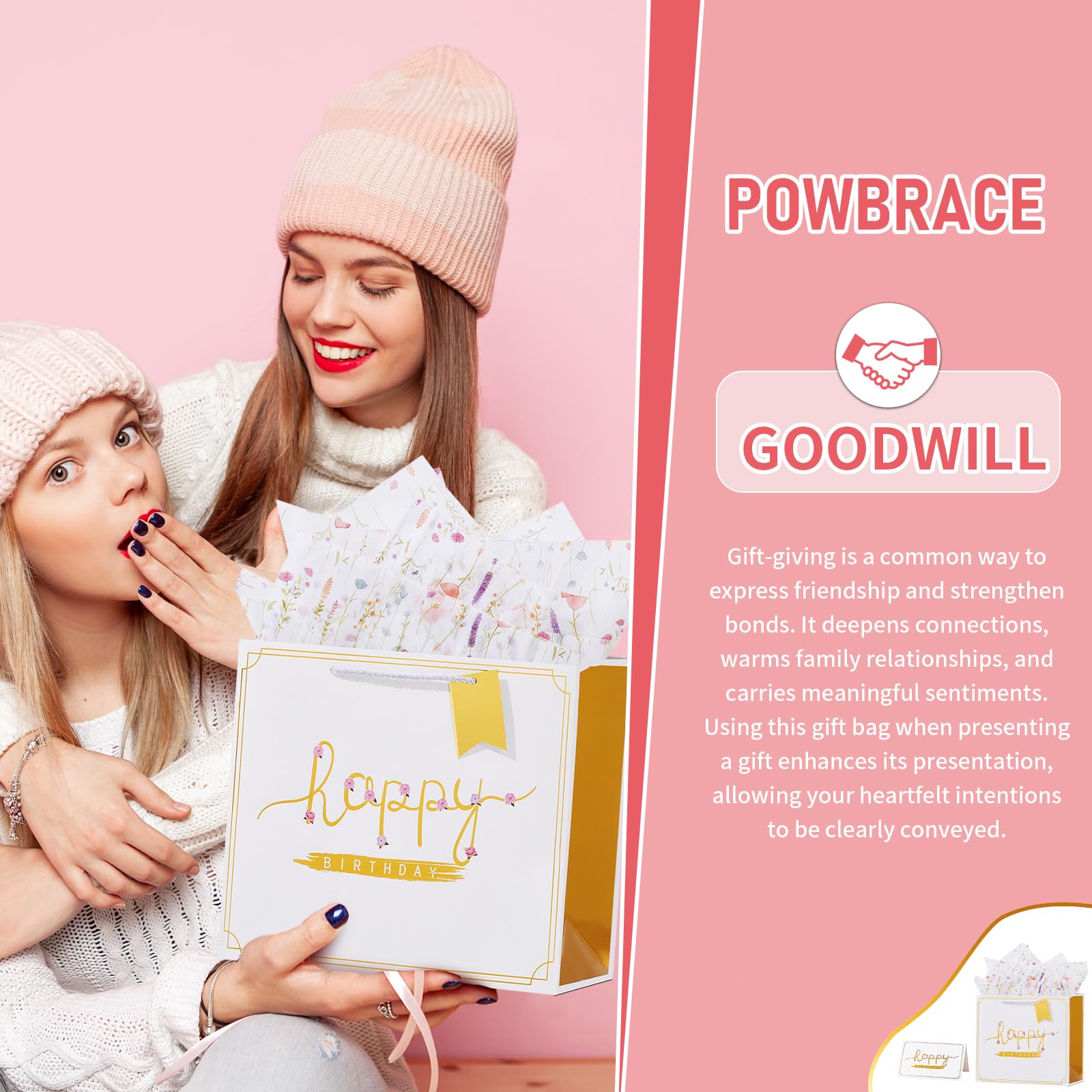 This birthday gift bag set includes a single or double pack option. The single pack contains one 13"W x 10.2"H x 4.7"D gift bag, a 7.9"x5.9" greeting card, and two tissue papers. The double pack adds an extra bag, card, and tissues. Made of durable paper, the bag features a white floral design with hot-stamped "Happy Birthday" text and ribbon handles. Matching cards, tags, and tissues are included. Its simple yet elegant style suits gifts for family, friends, or coworkers and can be reused for storage or shopping. No additional decoration is needed.