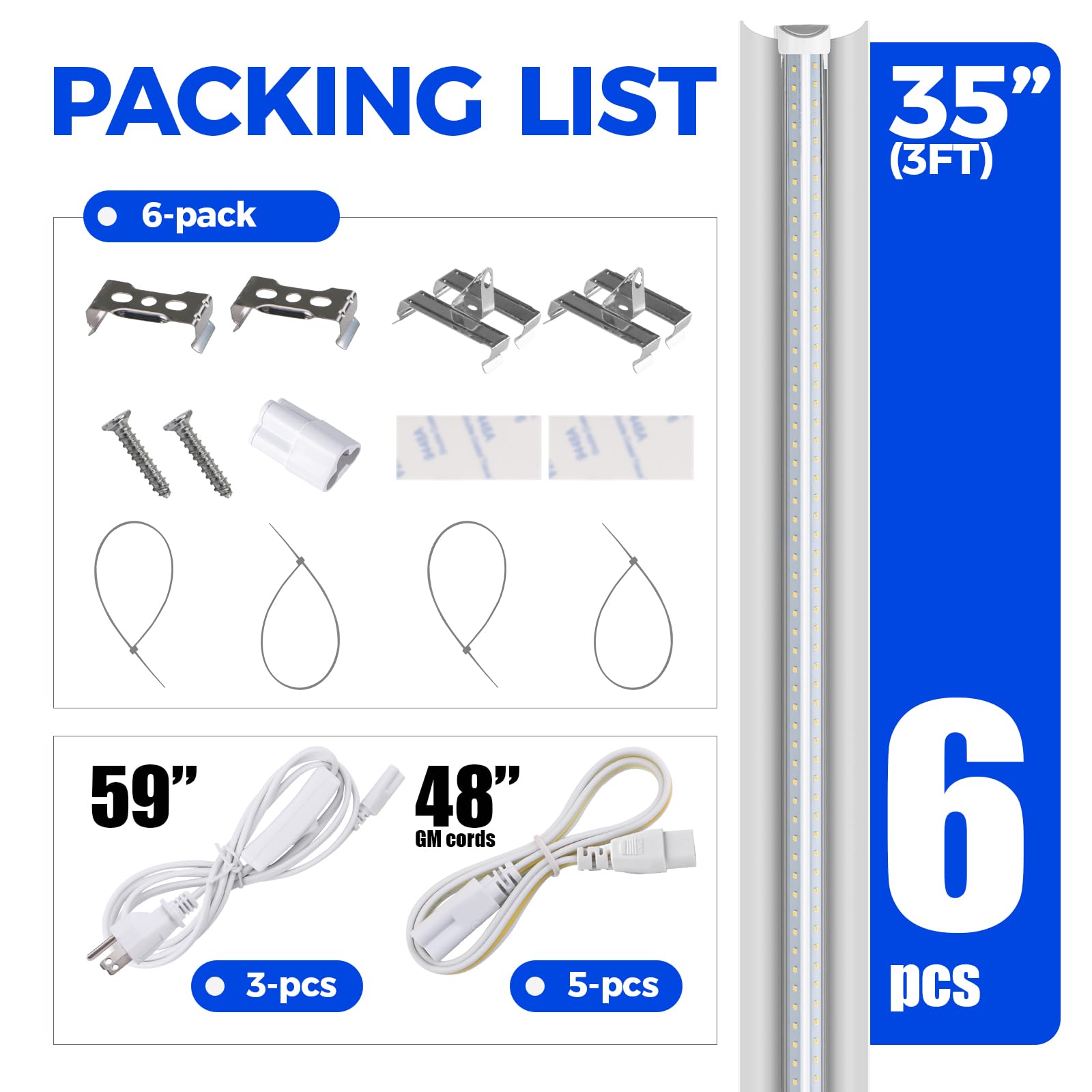 What You Get: 6 x Barrina LED Grow lights, 3 x Power cords with ON/OFF switch, 5 x Connecting Cords(48''), 6 x Small Connectors, 24x Installation Clips, 12 x Tapes, 24 x cable ties