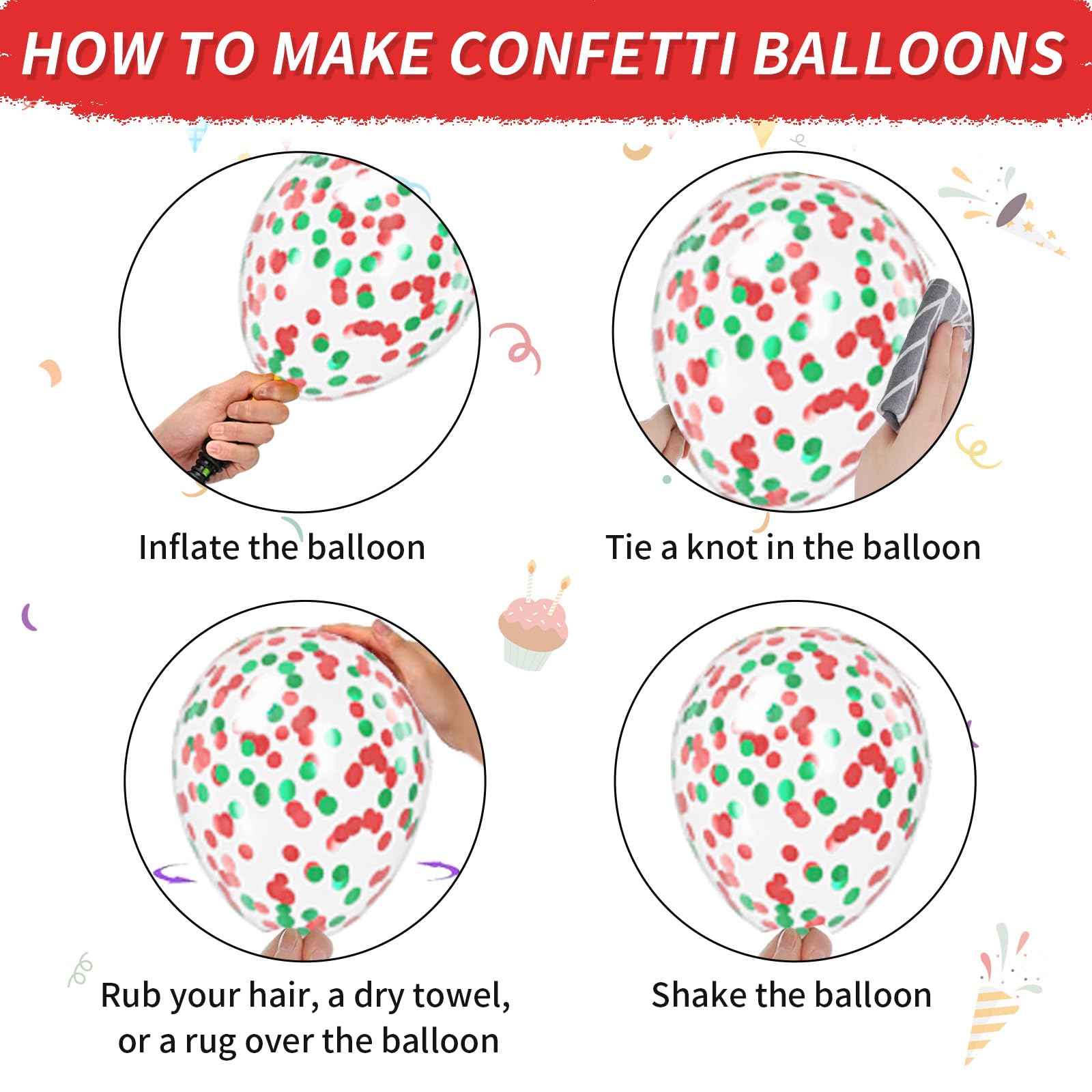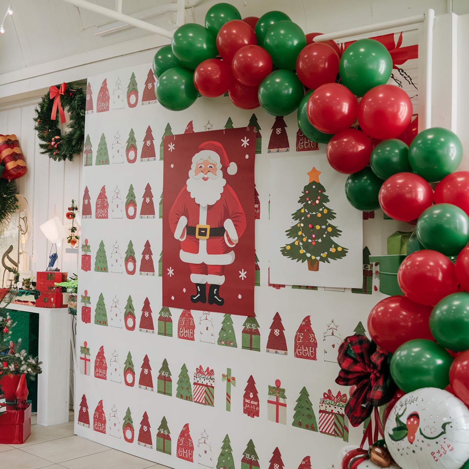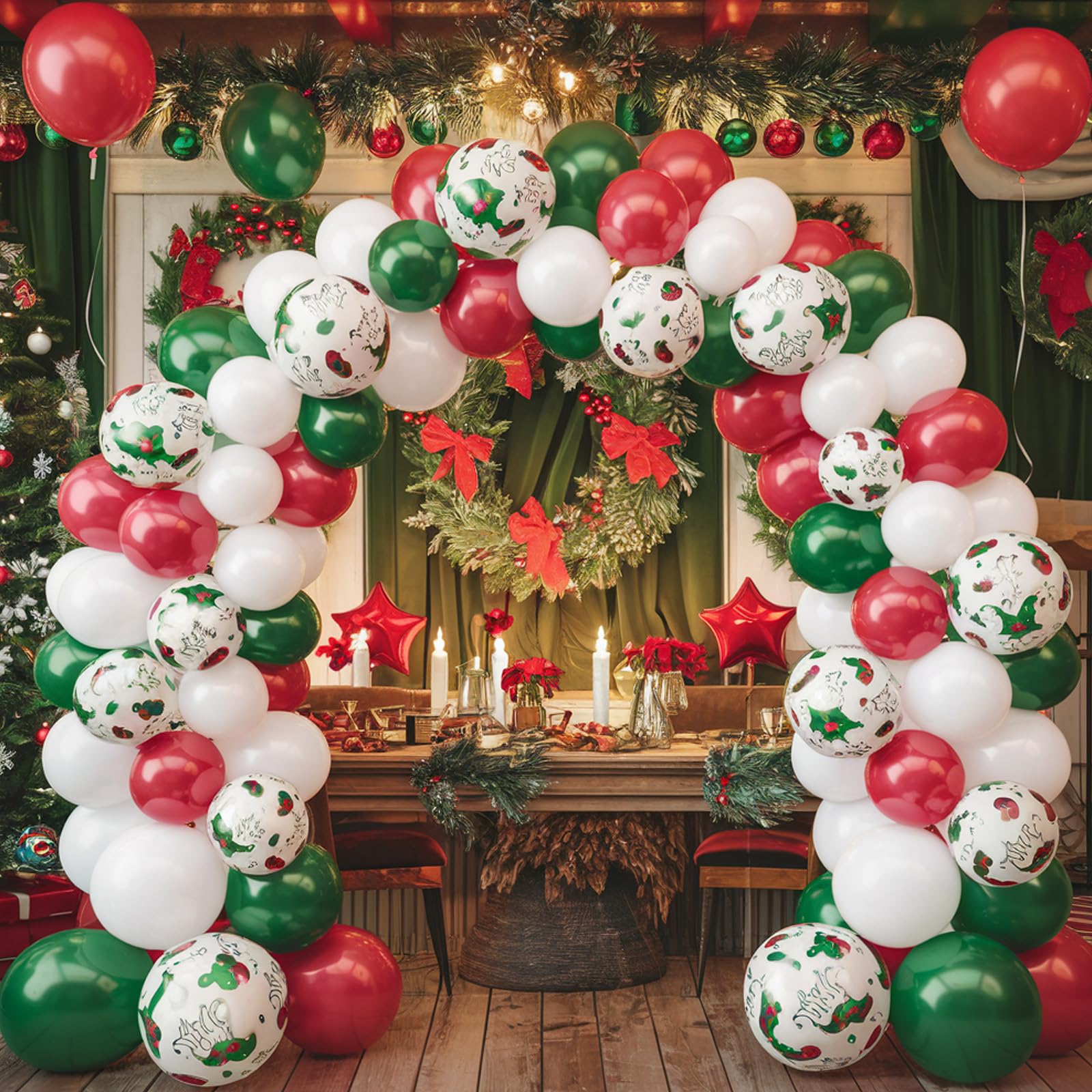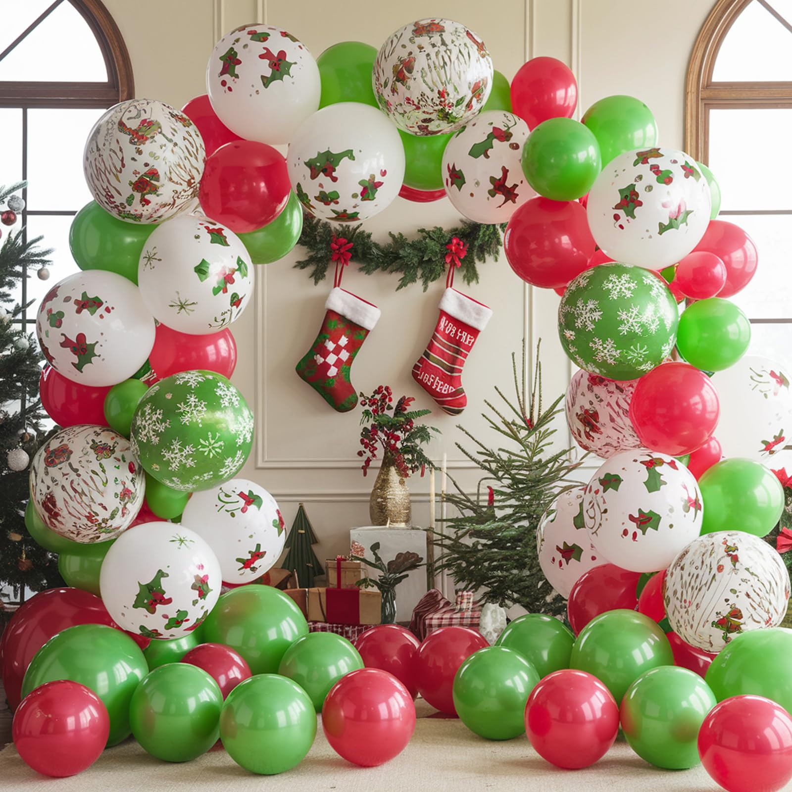 12-inch Christmas balloons: Package includes 6 reindeer print balloons, 6 Merry Christmas balloons, 6 Santa Claus balloons, 9 white balloons, 8 red balloons, 8 green balloons, 5 red and green balloons, 2 balloon ribbons