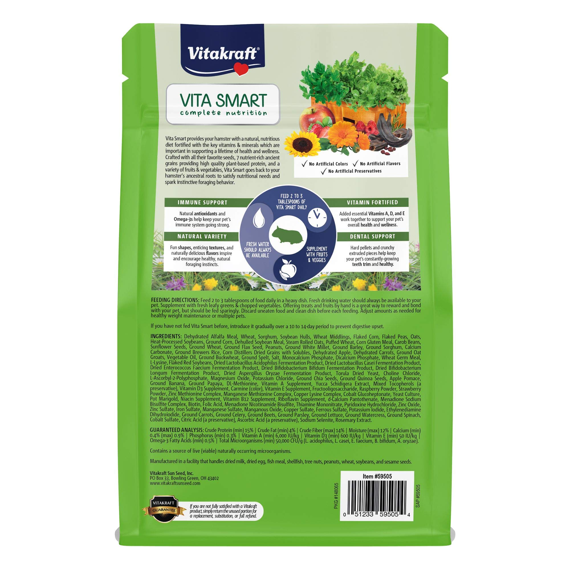 Vitakraft’s Vita Smart adult hamster food is fortified with key vitamins, minerals, and nutrients to help maintain health and wellness. This premium small animal food has grain and alfalfa pellets for hamster health, building the foundation of a high-fiber diet. Enriched hamster food pellets, mixed vegetables, and whole grains helps keep pet hamsters healthy and satisfied. If you want to pamper your small pet select hamster food by Vitakraft!