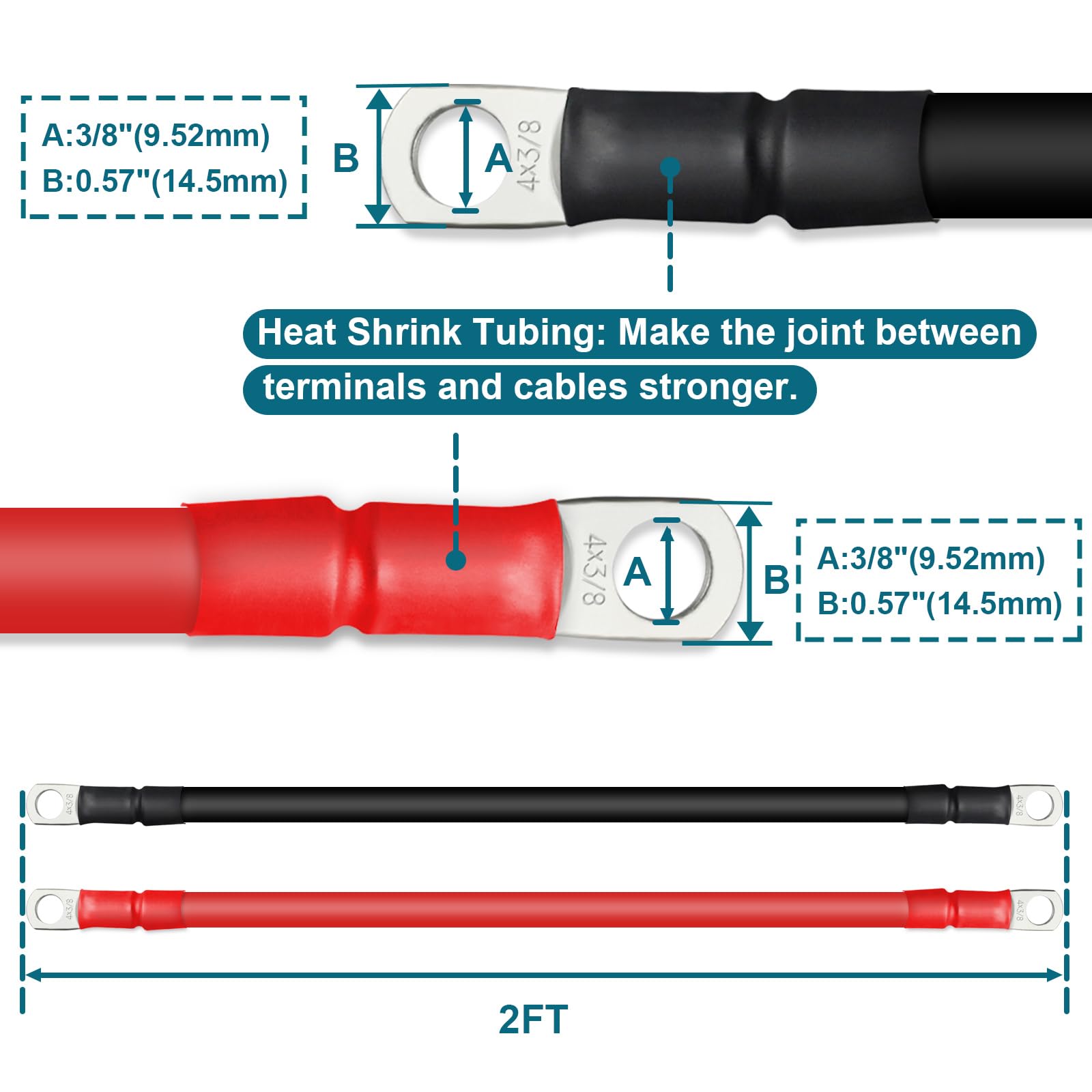 Strong Structure: Solid terminals on the both sides of the battery cable allow you to connect more easily. In addition, the heat-shrinkable tubing makes the joint between terminals and cables stronger, ensuring safety.