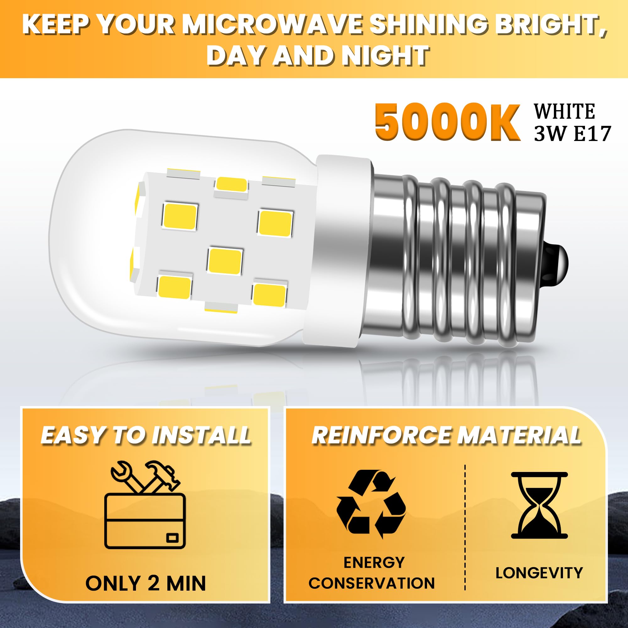 [Energy Saving+Long lifespan]: Cool White CRI>85Ra, E17 5000k white LED Microwave light bulb 3W 380lm Can be used with any 125V E17 base lamp, Equivalent to 40W incandescent bulb.Microwave light bulbs under hood use of high-quality led chips with glass cover, saving 90% of energy costs,oven light bulb Improve lighting performance while reducing energy consumption,so the bulbs can have long lifespan, up to 30,000 hours lifespan