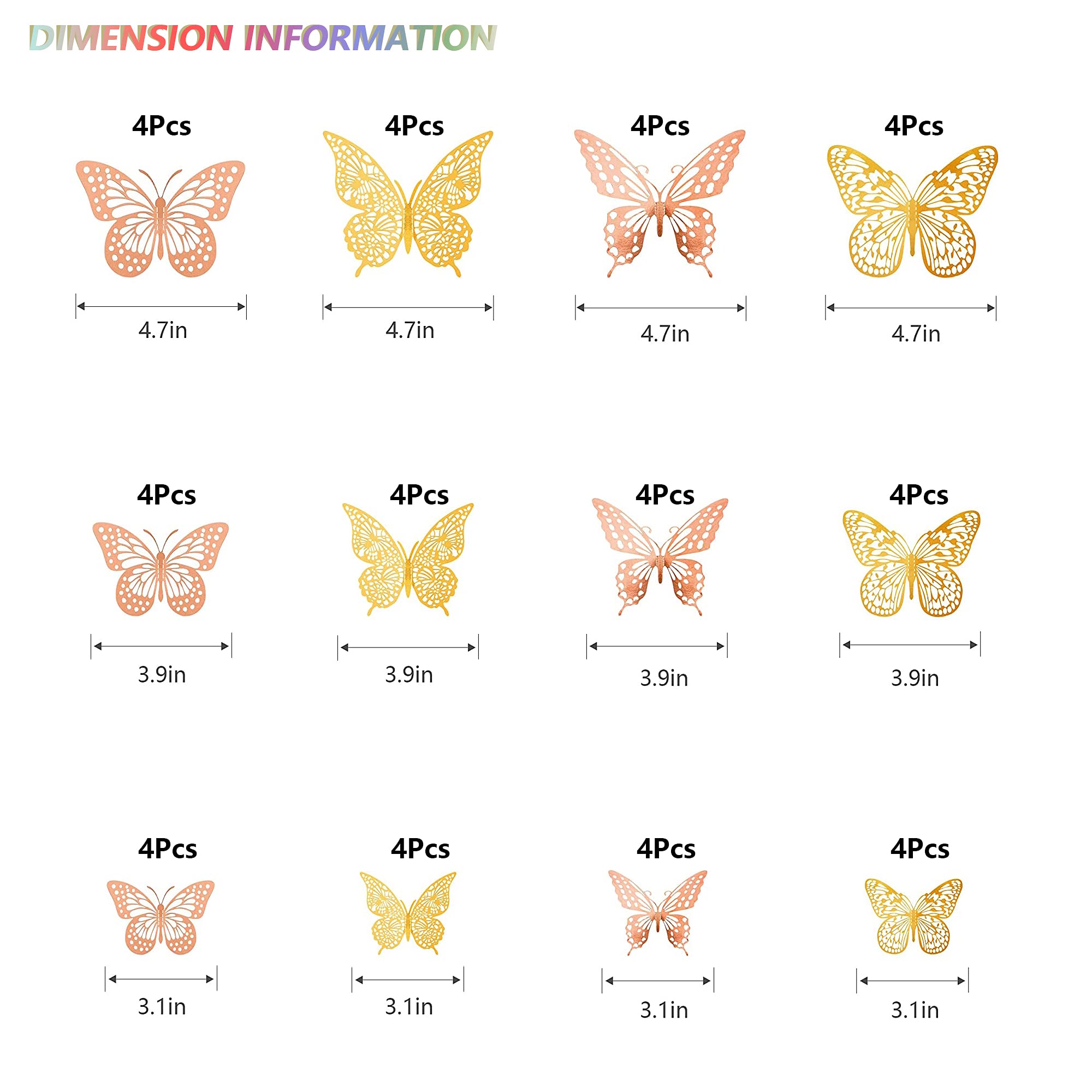 【Package Included】72pcs butterfly wall stickers: 36 pcs Style 1, 36 pcs Style 2, each style has 3 sizes(3", 4", 5") and each size has 4pcs. Coming with 72pcs double sided adhesive dots.