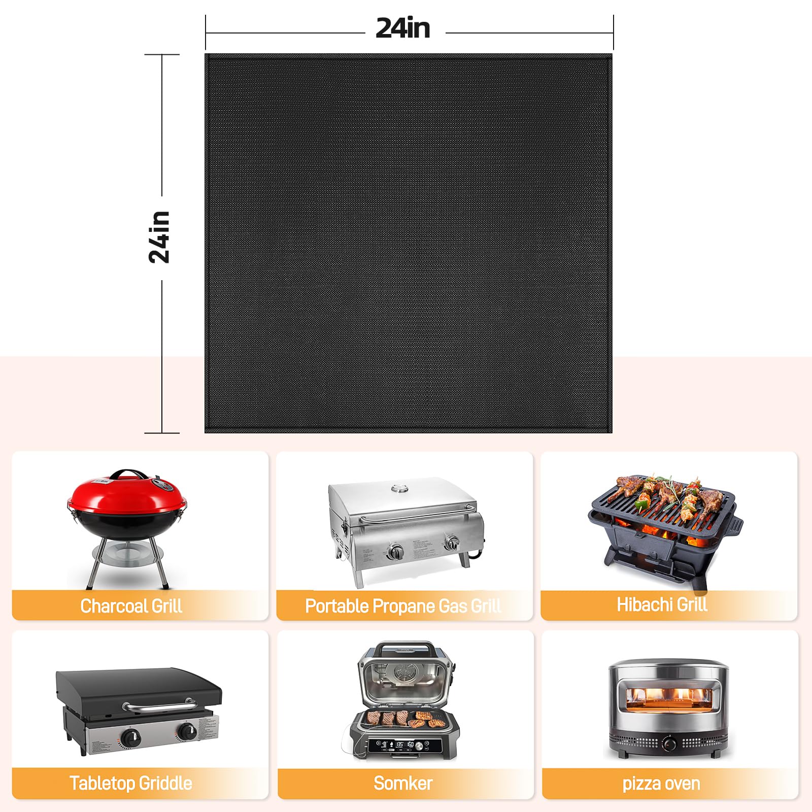 【Fireproof & Heat Resistant】Our grill mat for outdoor grill is made of fiberglass, heat resistant silicone resin coated on both sides, which can provide heat resistance up to 550℃/1022℉. Our heat resistant mats have finely stitched edges. It won't stick, tear, curl or crack from heat.