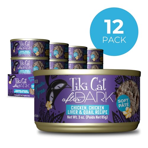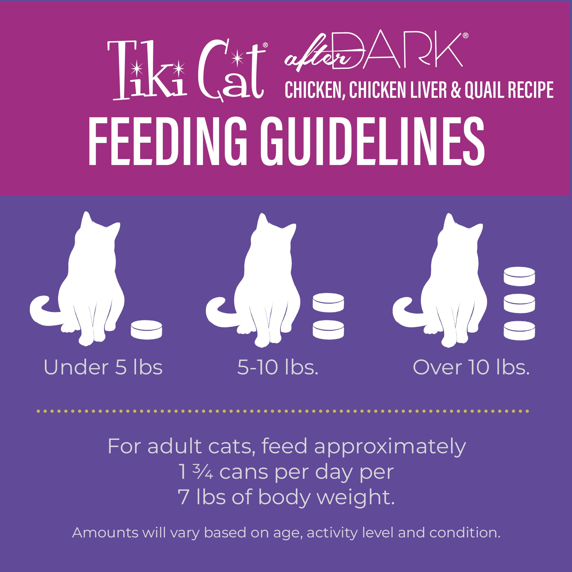 Cats know the best hunting happens after dark. Awaken your cat’s instinctual desires for protein with Tiki Cat After Dark Pate wet cat food. This complete and balanced meal closely mimics cats’ natural prey diets as obligate carnivores, featuring real, finely minced chicken and quail blended with delectable bits of chicken liver in a savory, easy-to-eat pate. Each can of Tiki Cat After Dark Pate wet cat food gives cats the high-protein, grain free nutrition they need with no carrageenan, no vegetables and no artificial preservatives. Open a can of this nutritionally correct, deliciously indulgent pate and watch your cat go wild! High-protein, complete and balanced cat canned food Chicken is the first ingredient Made with nutrient-dense organ meat For adult cats Grain free with no carrageenan, veggies or artificial preservatives