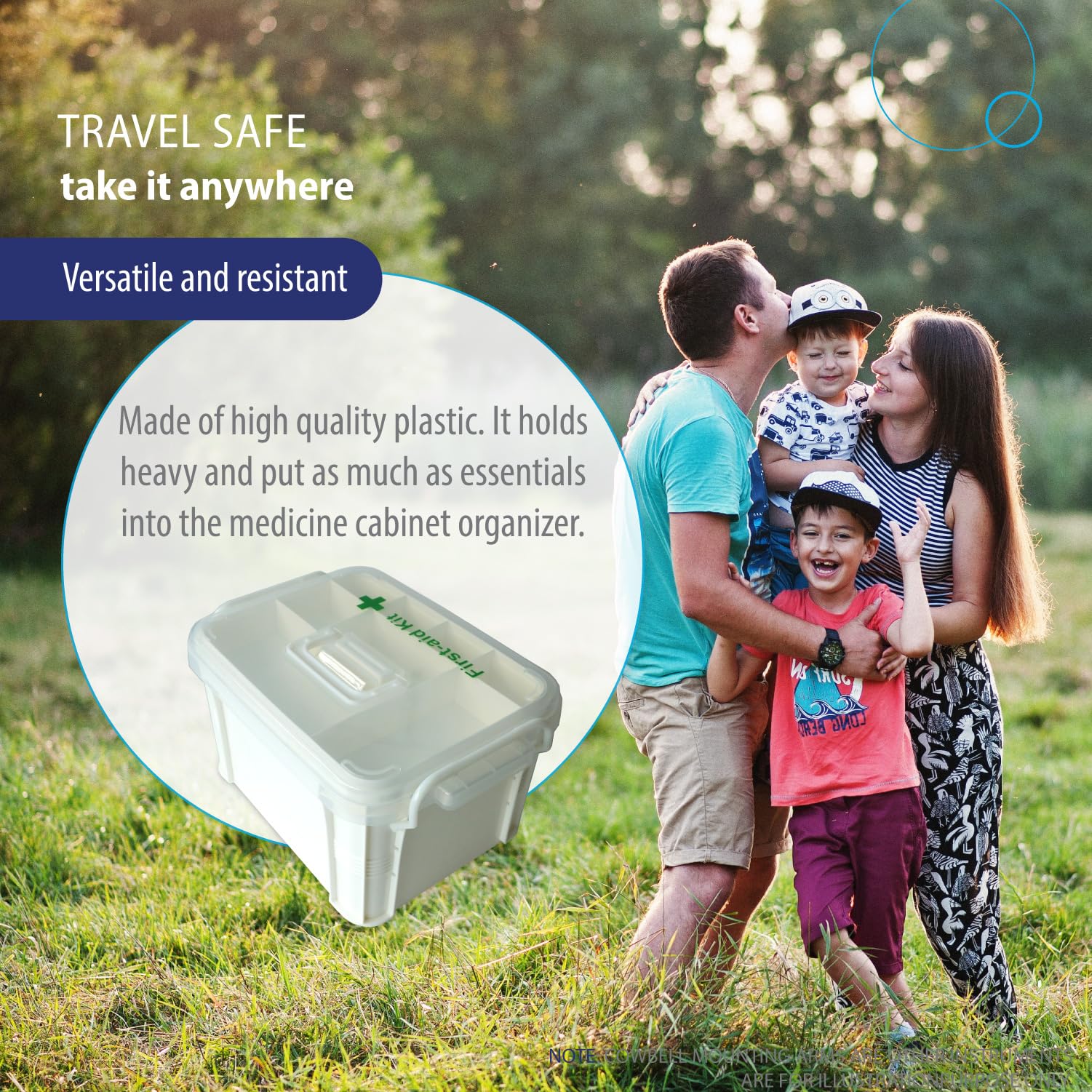 Double Layer Design with Removable Dividers: Features an insert divider tray to keep medications, thermometer, cotton swabs, and small medical supplies neatly organized. The spacious lower layer stores large bottles and essentials. Perfect for pill organization with 6 compartments for easy classification.