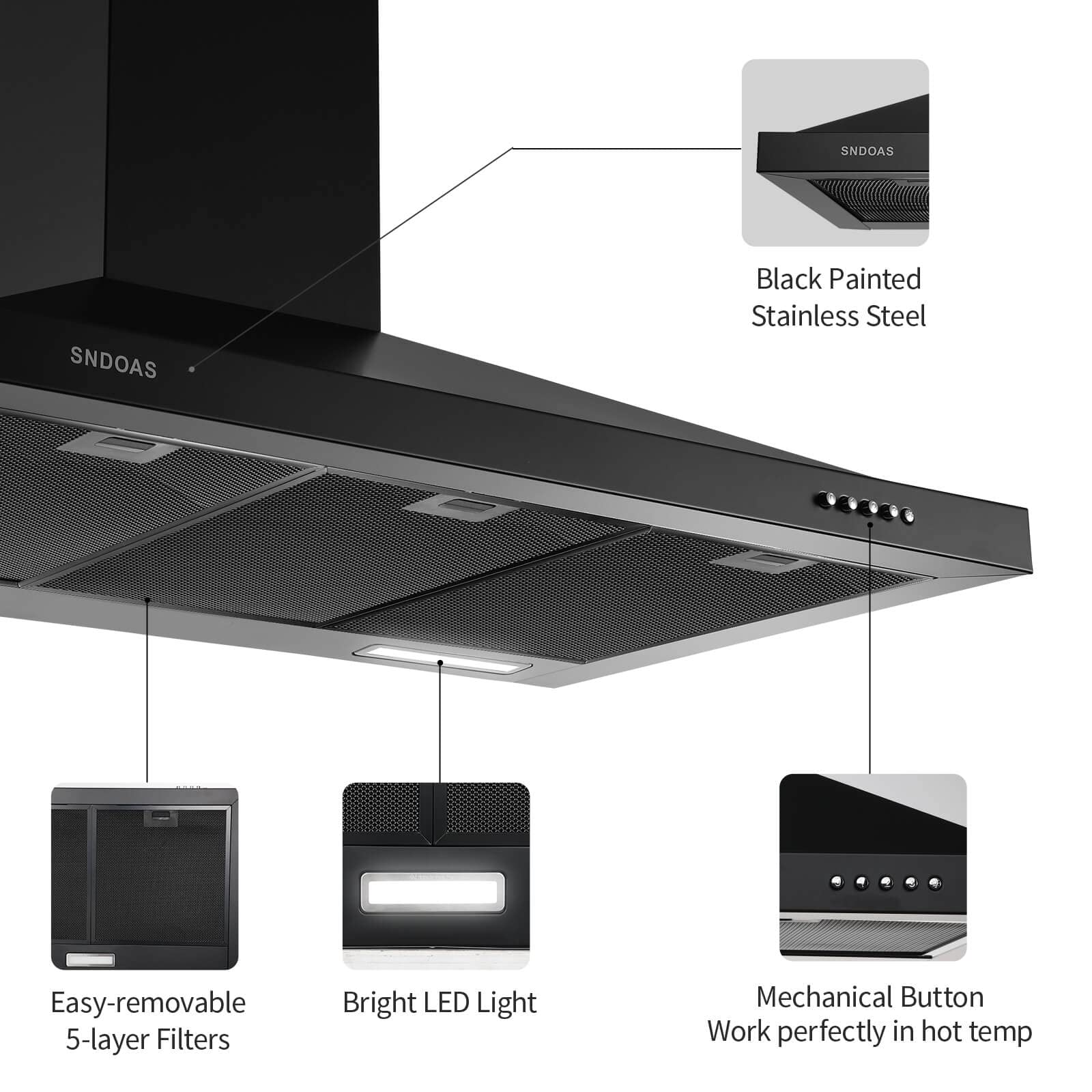 Heavy Duty Black Kitchen Range Hood:Made of Premium 430 grade stainless steel, black painted finish body + black aluminum grease filters, high end kitchen hood, perfect for modern european kitchen style. 5-layers filters are removable, pretty easy to clean up.