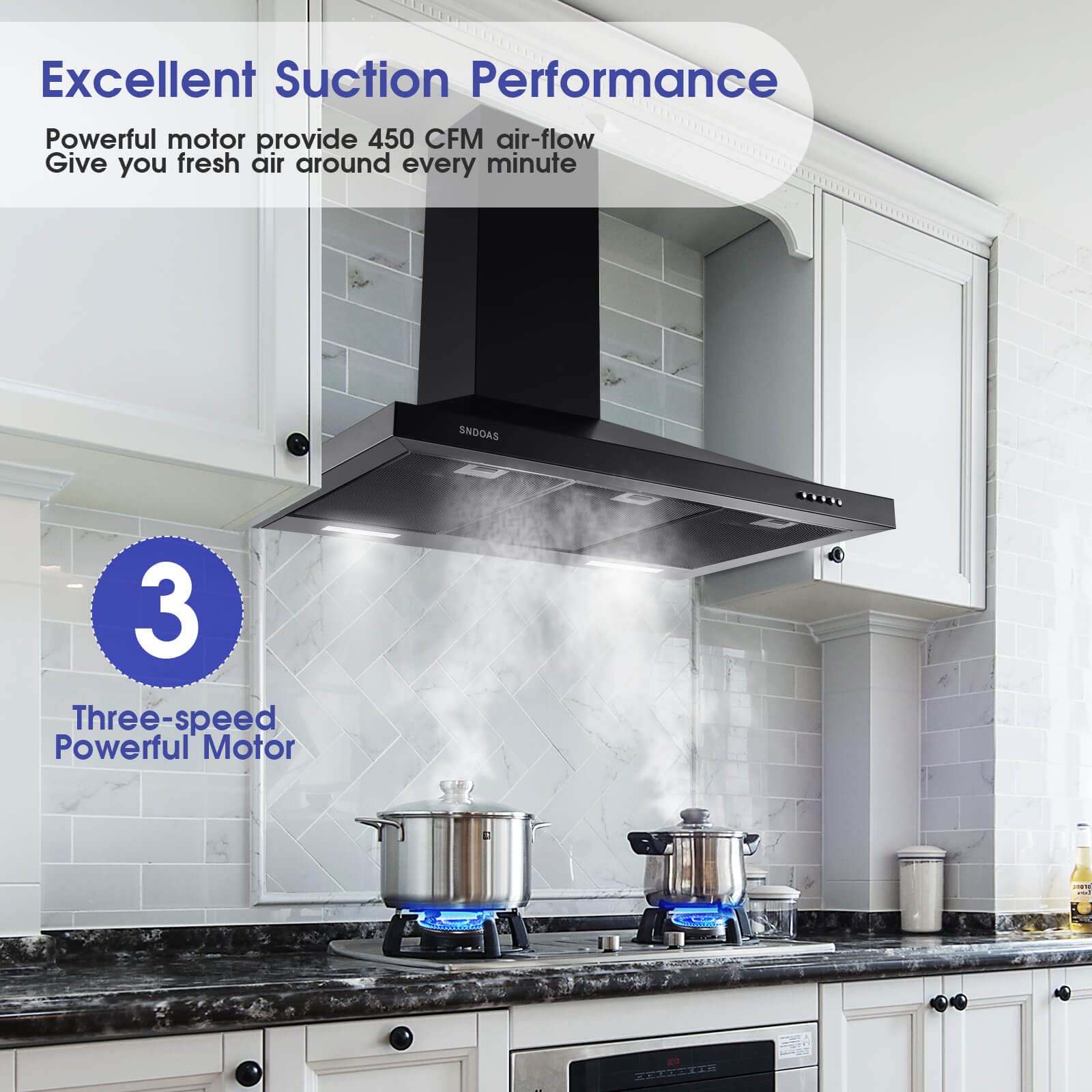 Ultra Quiet Operation:Powerful 450 CFM airflow with 3-speed push button controls(Low, Mid, and High), noise of range hood fan less than 55dB at high speed. LED lamp can provide extra light you may need when cooking.