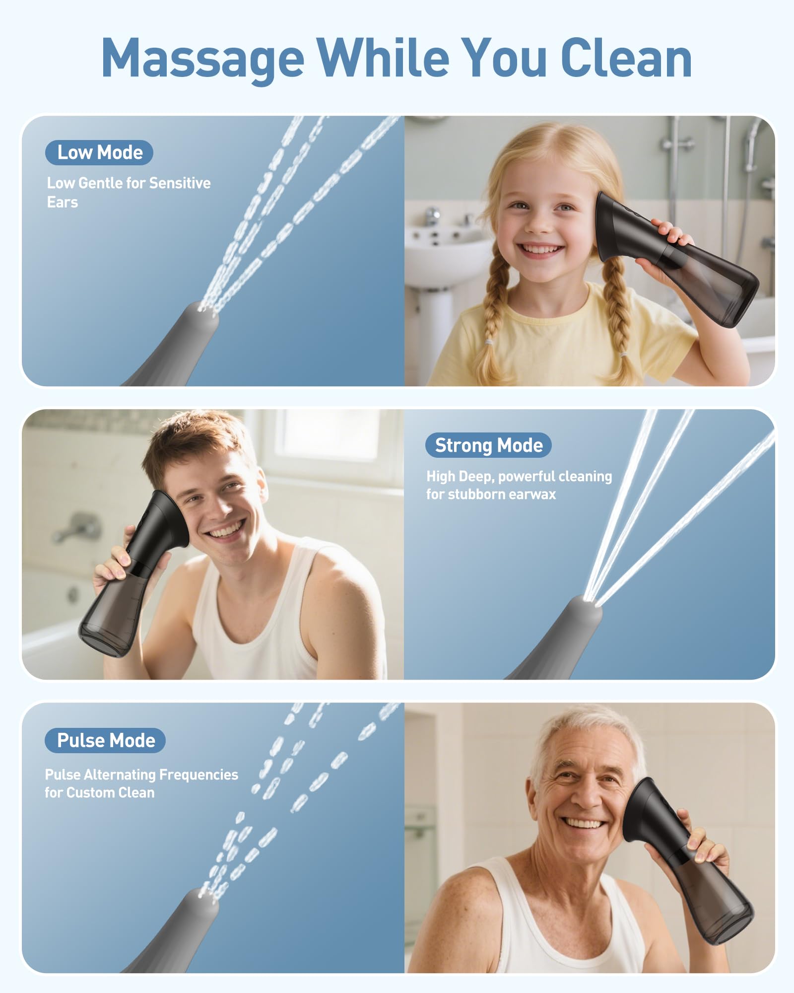 Tailored for Every Ear: Choose from 3 pressure settings — Low, Pulse, and High — to easily tackle daily cleaning or stubborn earwax buildup, itching, clogging, and relieve ear discomfort. The ear cleaner is suitable for kids too. Comes with 12 color-coded tips (1, 3, and 5-hole) providing up to 9 spray options for earwax removal. One device with personal pressure settings and tips for each family member keeps ears clean and healthy